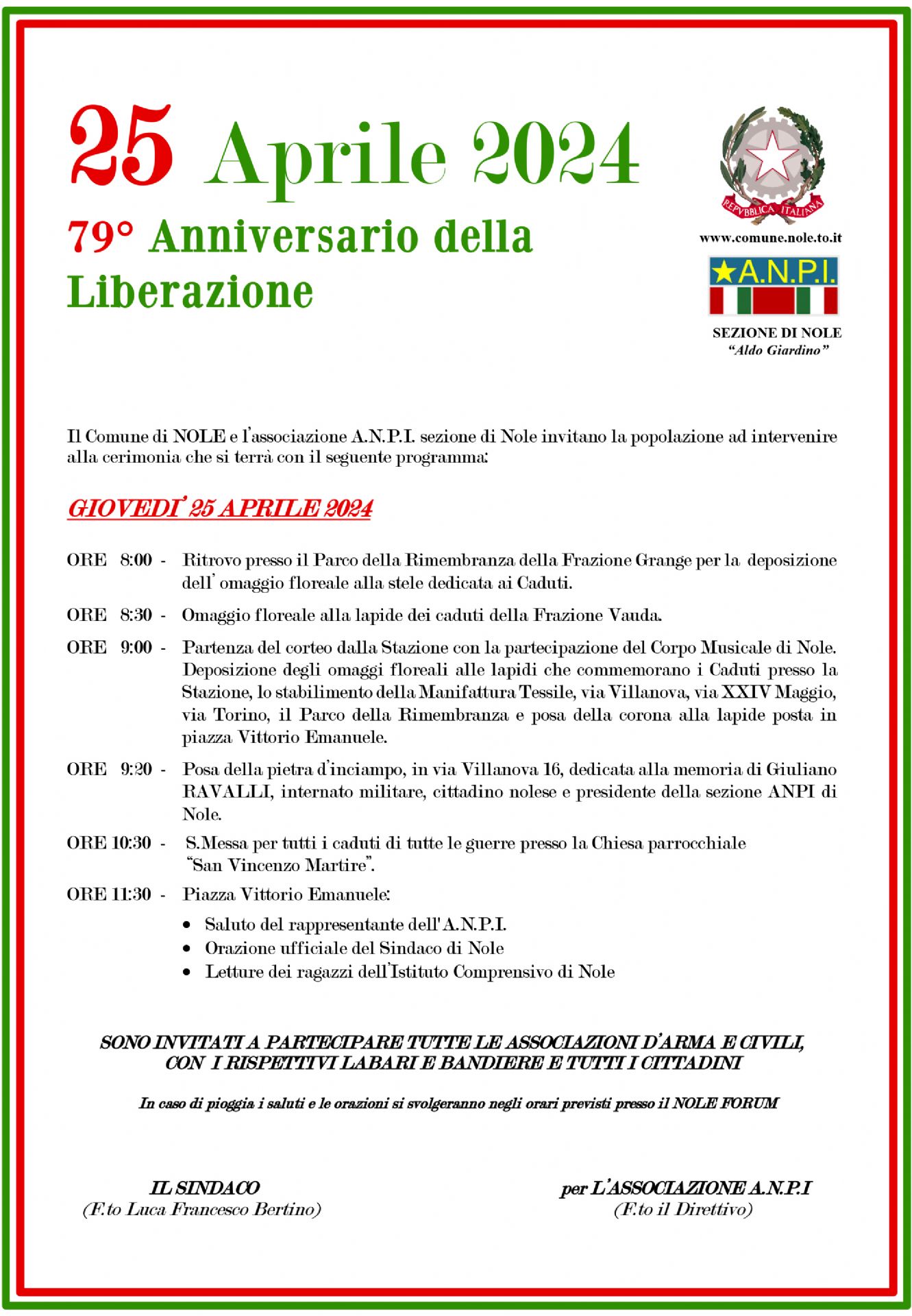 Si invita la cittadinanza a partecipare al 79° Anniversario della Liberazione. Il programma dell'evento lo trovate in allegato.