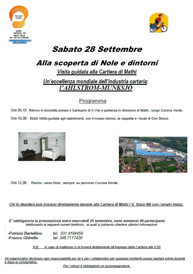 Il gruppo nolese per l'arte e la storia "'L Nòst Pais" organizza per sabato 28 settembre 2019 "Alla scoperta di Nole e dintorni", visita guidata alla cartiera di Mathi, eccellenza mondiale dell'industria cartaria.