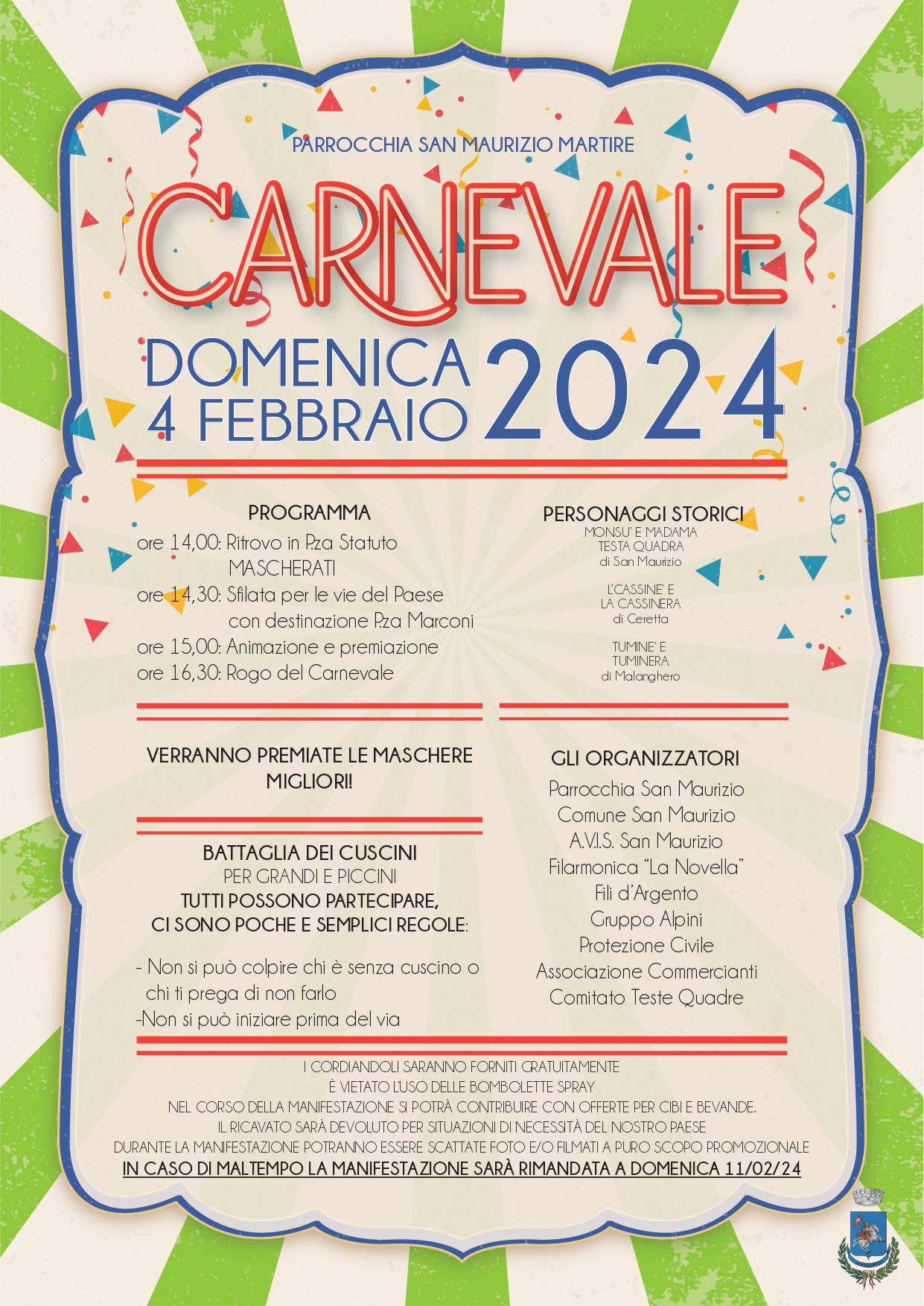 È il momento del nostro grande Carnevale in piazza! Un appuntamento tradizionale organizzato dalla parrocchia di San Maurizio Martire insieme a Comune, Avis, Filarmonica La Novella, Fili d'Argento, Alpini, Protezione Civile, Vigili del Fuoco, Associazione Commercianti, Comitato Teste Quadre.