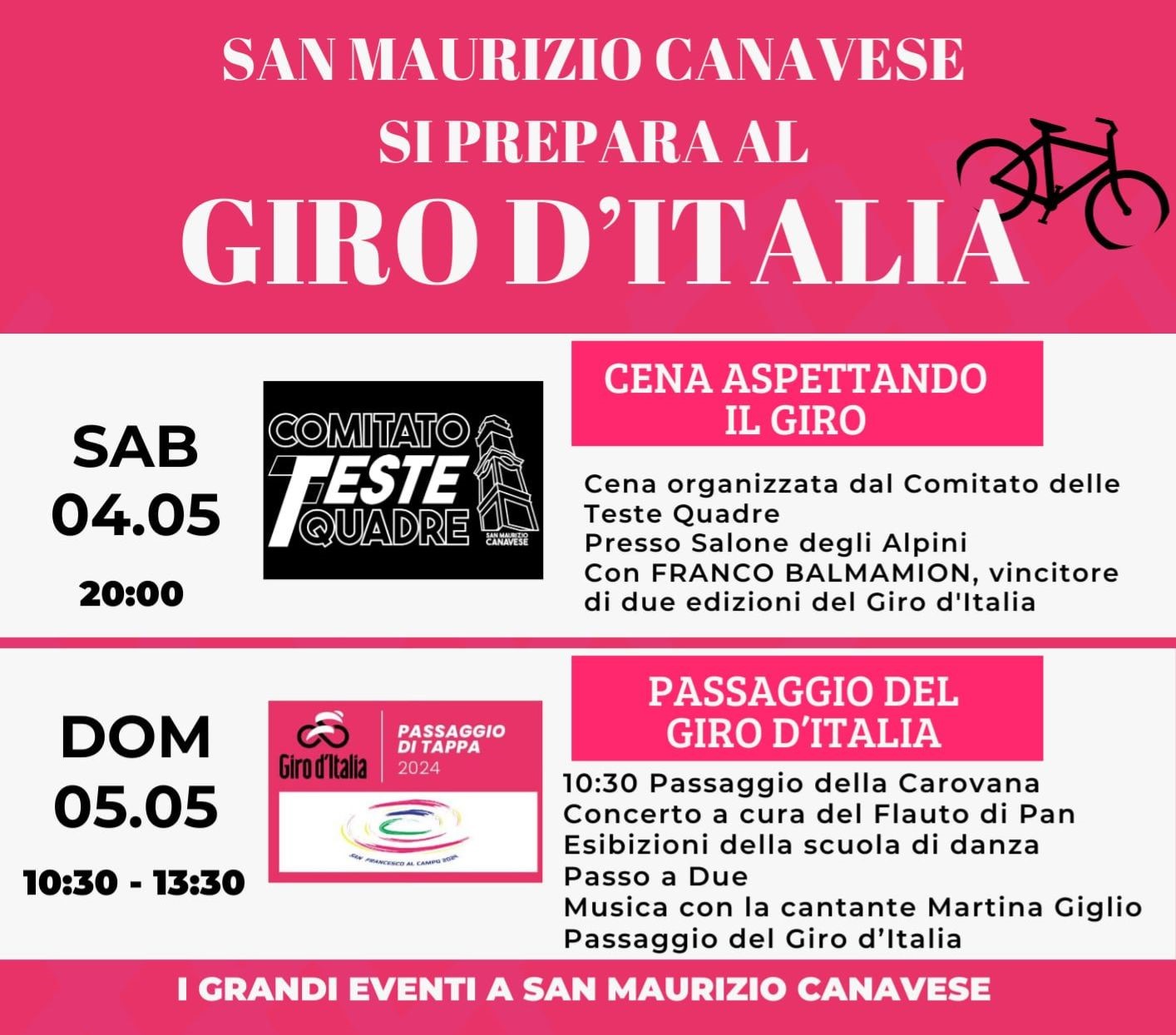 Anche San Maurizio Canavese si prepara al passaggio della seconda tappa del Giro d'Italia 2024, da San Francesco al Campo al Santuario di Oropa, in programma domenica 5 maggio. Due i momenti di festa e spettacolo in attesa della Corsa Rosa fino al giorno della tappa. Alleghiamo qui sotto la locandina.