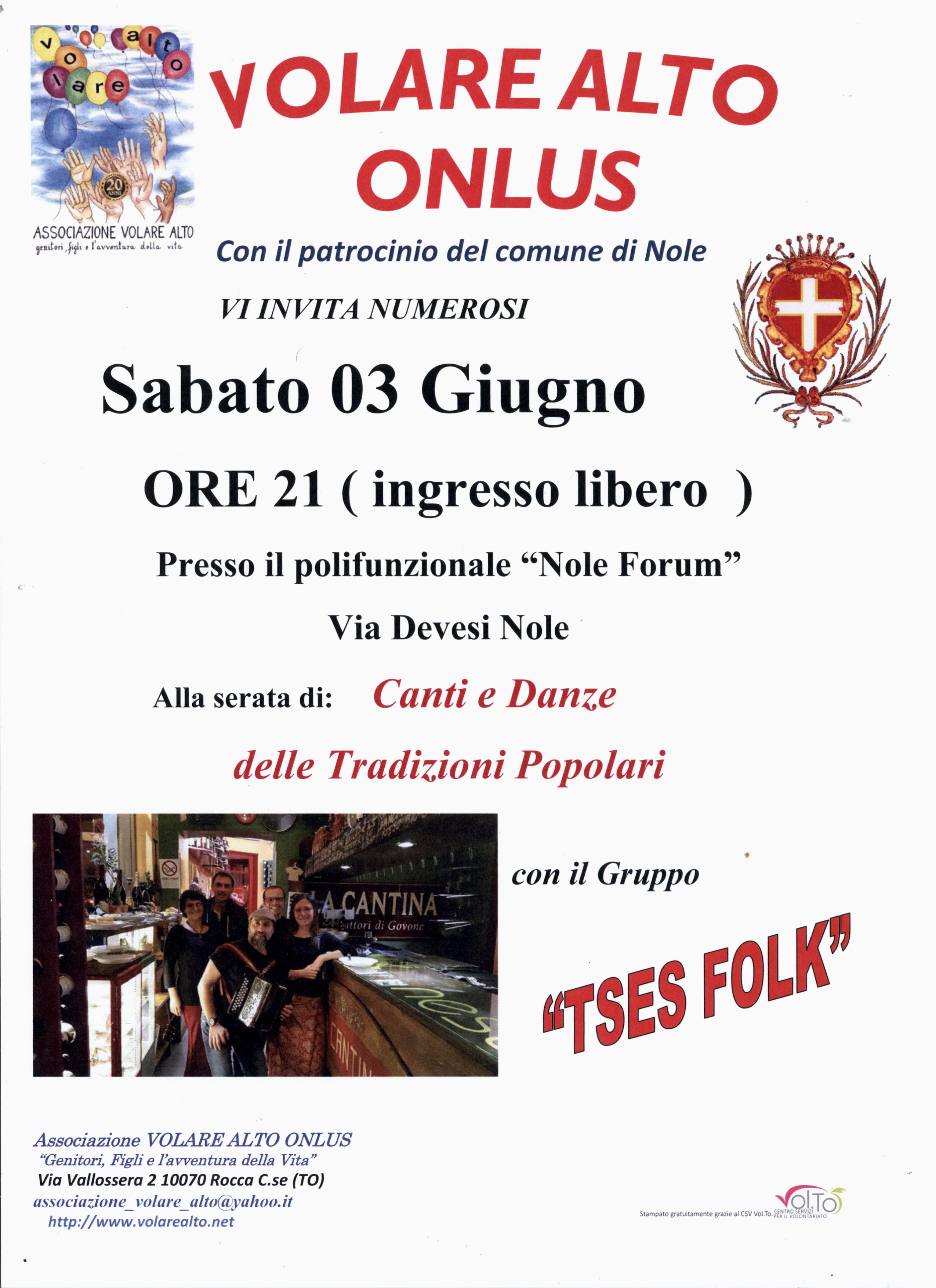 "Volare Alto" onlus, con il patrocinio del Comune di Nole organizza per sabato 3 giugno 2017 ore 21,00 una serata di canti e danze delle tradizioni popolari con il gruppo "TSES FOLK".