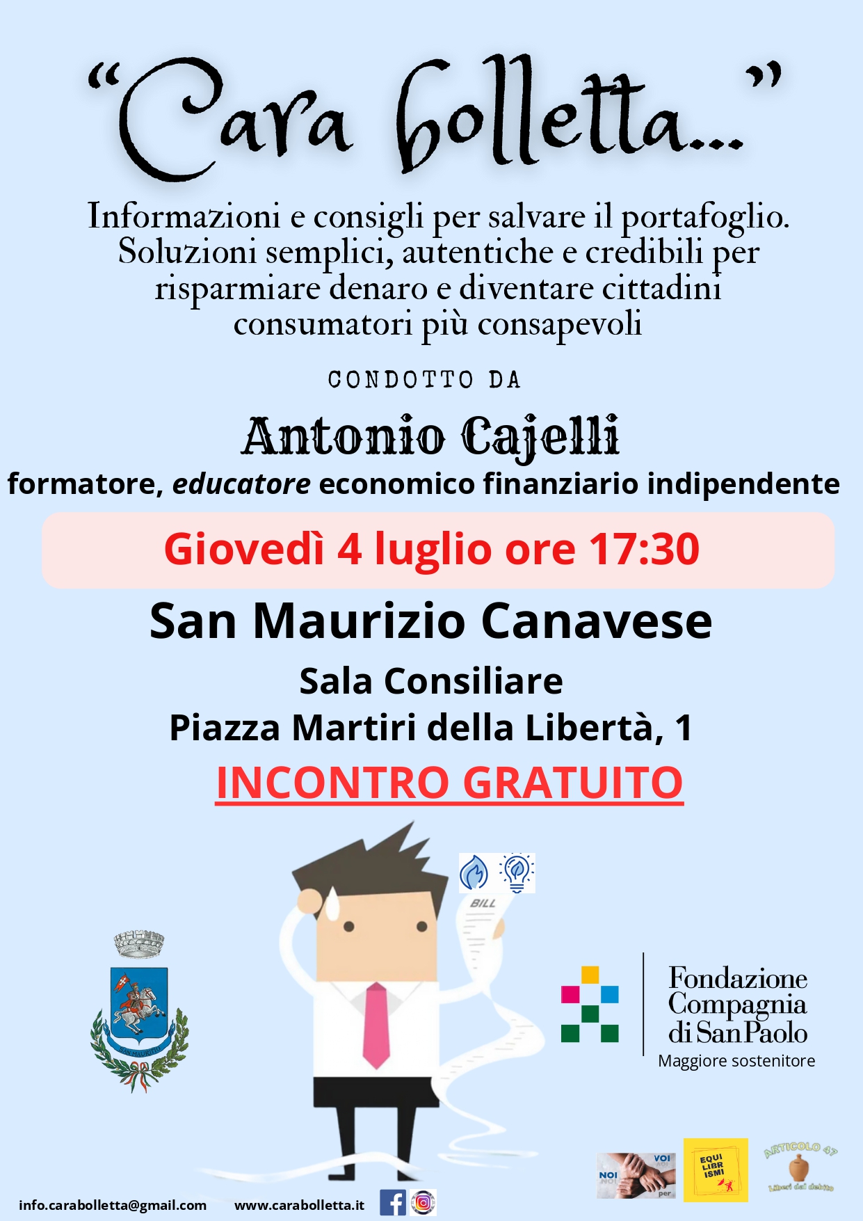 Si svolgerà giovedì 4 luglio alle ore 17.30 nella sala consiliare del municipio l'incontro "Cara bolletta... Informazioni e consigli per salvare il portafoglio. Soluzioni semplici, autentiche e credibili per risparmiare denaro e diventare cittadini consumatori più consapevoli" condotto da Antonio Cajelli e con il sostegno della Fondazione Compagnia di San Paolo. L'evento è gratuito e aperto a tutti.