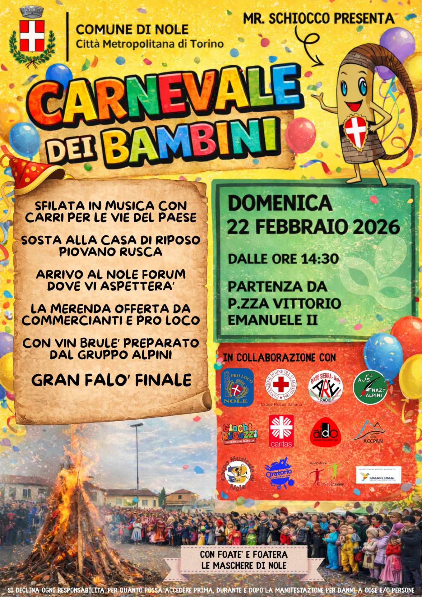 La sfilata - organizzata dal Comune di Nole con il sostegno delle associazioni - partirà alle 14,30 da piazza Vittorio Emanuele II e attraverserà le vie del paese, con una sosta alla Casa di Riposo Piovano Rusca, per poi concludersi al NoleForum, dove ad attendere i partecipanti ci sarà una merenda offerta dai commercianti e dalla Pro Loco, con il vin brulé preparato dal Gruppo Alpini. E poi il gran finale con il tradizionale falò di Carnevale.