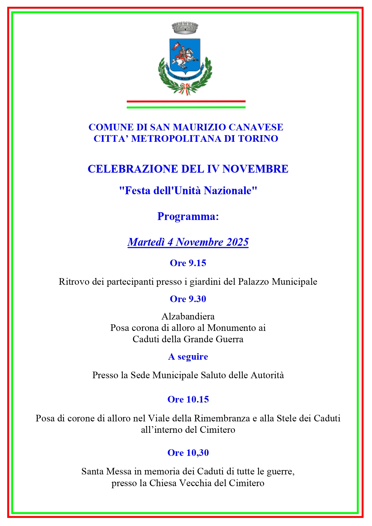Martedì 4 novembre anche il nostro Comune celebrerà la festa dell'Unità Nazionale.