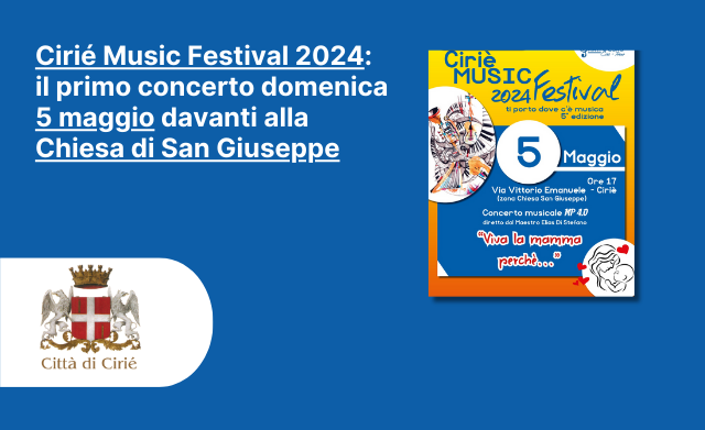 Sarà tutto dedicato alla Festa della Mamma il concerto “Viva la mamma perché…” dei Music Piemonteis MP 4.0 di domenica 5 maggio, che darà il via alla rassegna di musica bandistica Cirié Music Festival 2024, giunta ormai alla quinta edizione e organizzata dai Music piemonteis con il patrocinio della Città di Cirié e di Anbima.
