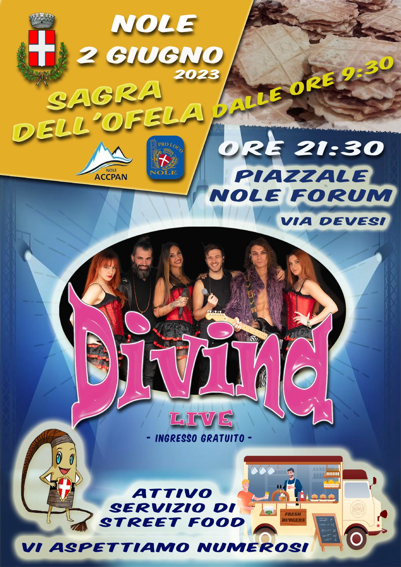In occasione della Sagra dell'Ofela si invitano i cittadini al concerto dei "Divina" che si terrà presso il Nole Forum alle ore 21:30, è inoltre previsto il servizio di street food.