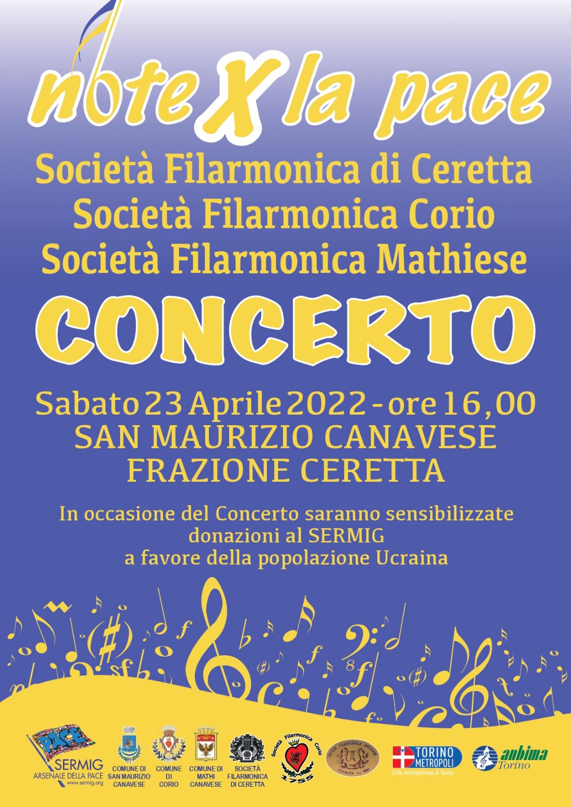 Sabato 23 aprile alle ore 16 in frazione Ceretta la Filarmonica di Ceretta, la Filarmonica di Corio e la Filarmonica Mathiese si esibiranno in "Note per la Pace".
