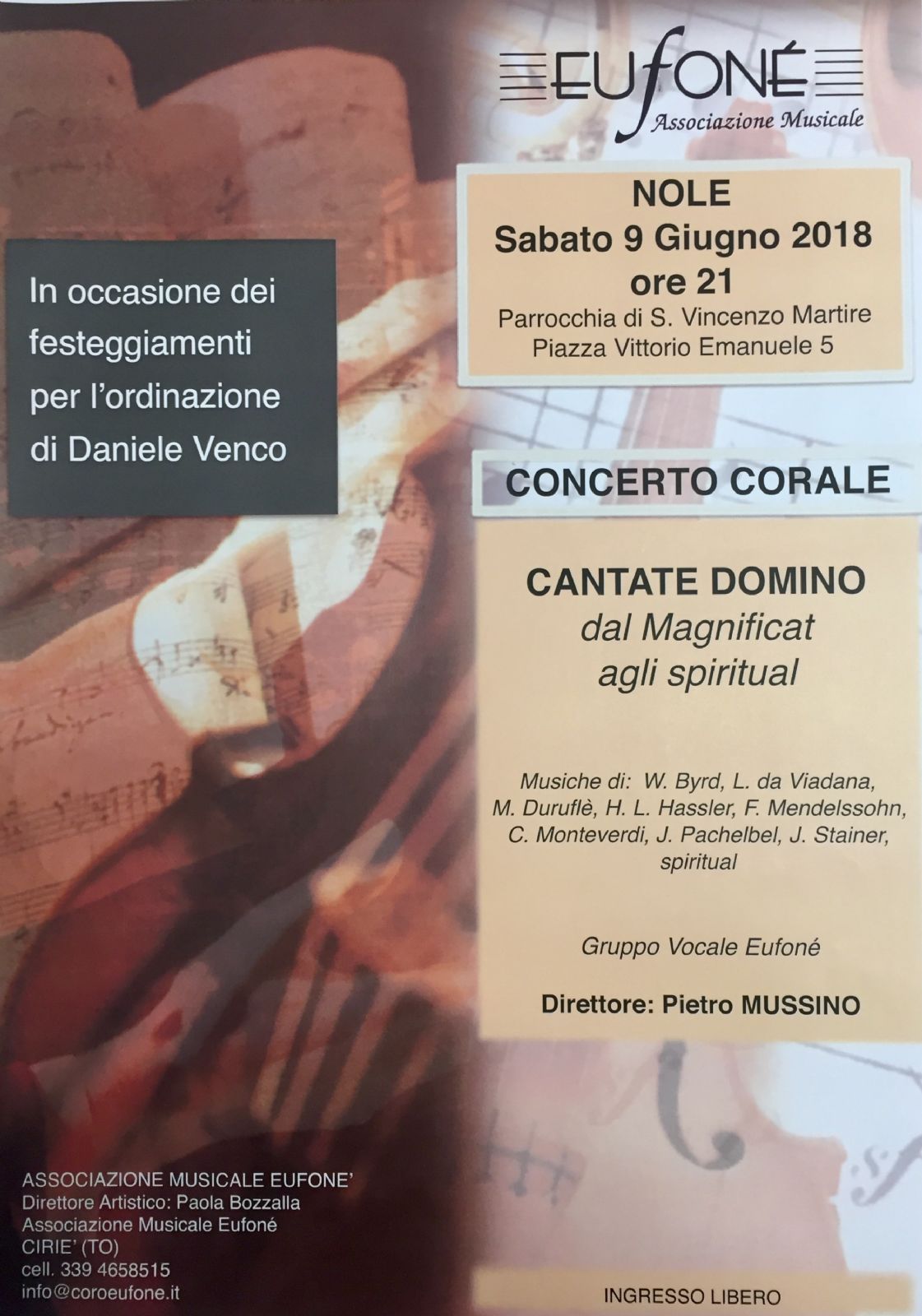 L'Associazione Musicale "Eufoné", in occasione dei festeggiamenti per l'ordinazione di Daniele Venco, presenterà "CANTATE DOMINO", dal magnificat agli spiritual. Concerto corale con musiche di W.Byrd, L. da Viadana, M.Duruflè, H.L.Hassler, F.Mendelssohn, C.Monteverdi, J.Pachelbel,J.Steiner, spiritual.