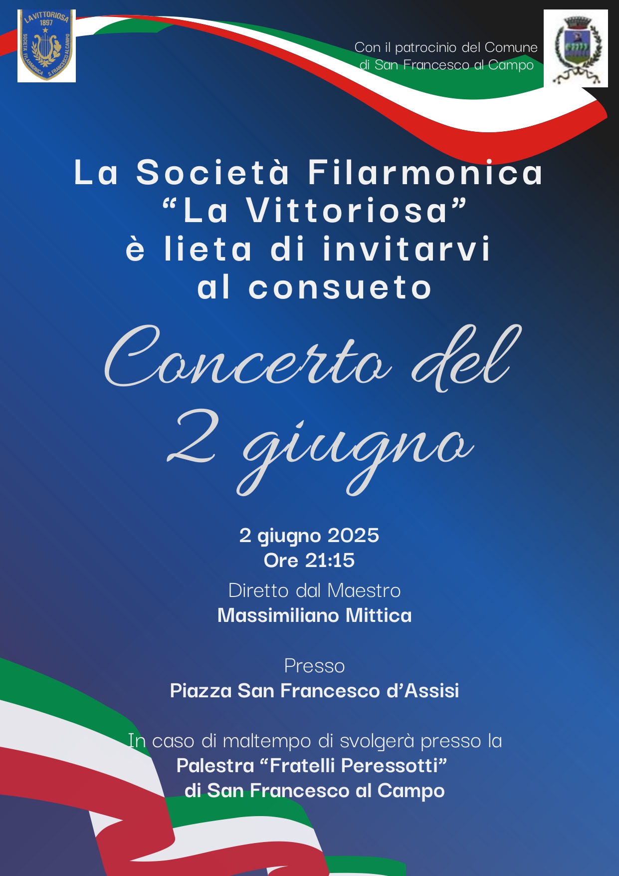 Nella serata di lunedì, Festa della Repubblica, la Filarmonica La Vittoriosa ci dà appuntamento alle ore 21.15 in piazza San Francesco d'Assisi per il tradizionale "Concerto del 2 Giugno". In caso di maltempo il concerto si svolgerà all'interno della palestra comunale.
