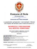 Lunedì 21 settembre 2015, alle ore 20,45, presso la sala consiliare del Comune di Nole si terrà l'incontro "SICUREZZA E PREVENZIONE SUL NOSTRO TERRITORIO" con la partecipazione del Maggiore Marco Porcedda (Comandante della Compagnia Carabinieri di Venaria), del Maresciallo Mario Mura (Comandante della stazione Carabinieri di Mathi), del Luogotenente Roberto Avona (Comandante della stazione della Guardia di Finanza di Lanzo).