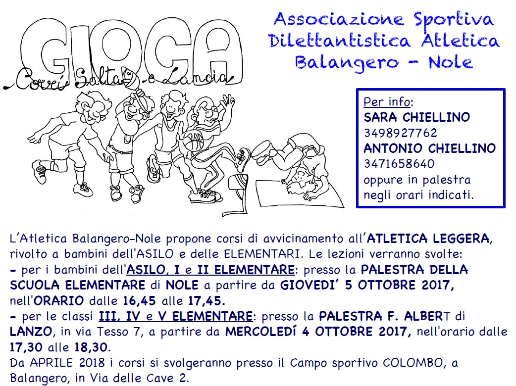 L'Atletica Balangero - Nole propone corsi di avvicinamento all'atletica leggera rivolto a bambini dell'asilo, I e II slementare.