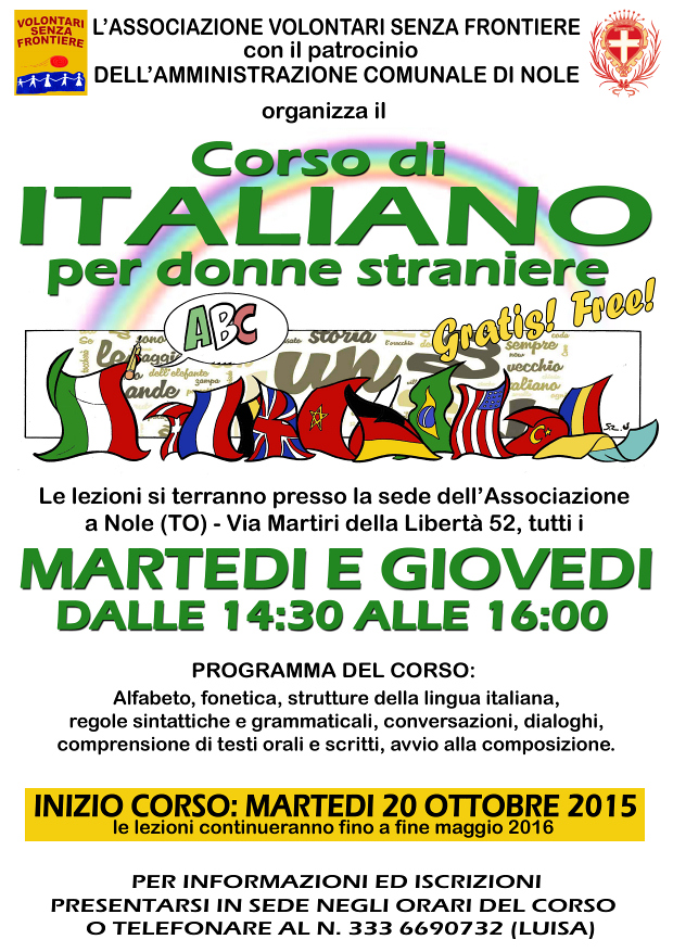 L'associazione Volontari senza frontiere, con il patrocinio del Comune di Nole, organizza il corso di italiano per donne straniere.