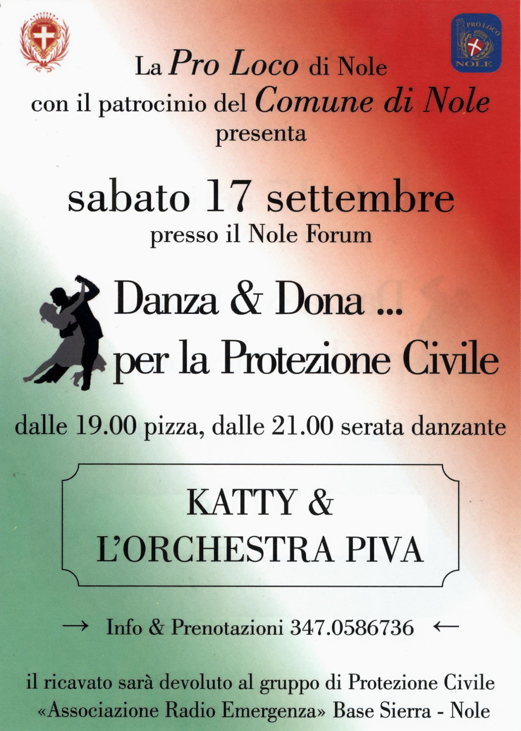 Sabato 17 settembre 2016, presso la struttura polivalente "Nole Forum" di via Devesi (ex Erber) si terrà la serata di beneficienza "Danza & Dona". Ore 19,00 pizza, ore 21,00 serata danzante con "Katty & l'orchestra piva".