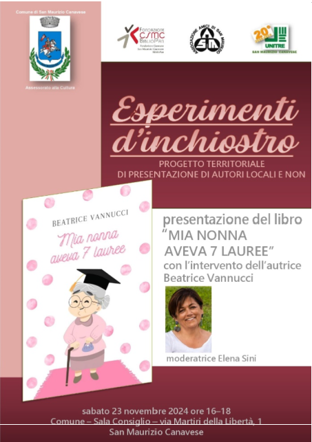 Sabato 23 novembre 2024, dalle 16.00 alle 18.00 circa, presso la Sala Consiglio del Comune di San Maurizio Canavese, Beatrice Vannucci presenterà il libro “Mia nonna aveva 7 lauree”.