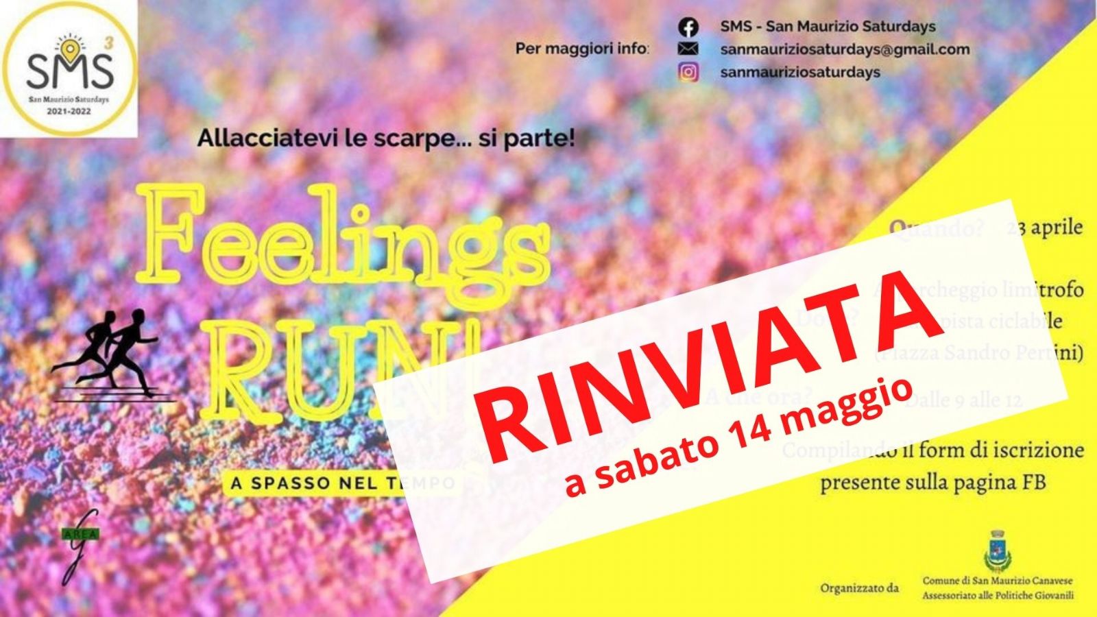 È stata rinviata a sabato 14 maggio "Feelings Run - A spasso nel tempo" il quarto appuntamento dell'edizione 2022 di SMS San Maurizio Saturdays, lo speciale programma di iniziative ed eventi dedicato ai giovanissimi e alle loro famiglie. Le previsioni meteo per la giornata di sabato 23 aprile hanno indotto gli organizzatori a non correre rischi inutili: è una manifestazione talmente bella, che sarebbe un peccato rovinare. L'appuntamento dunque è per sabato 14 maggio, sempre dalle 9 alle 12, in piazza Sandro Pertini. Nelle prossime settimane forniremo comunque nuove informazioni e un nuovo form per l'iscrizione.