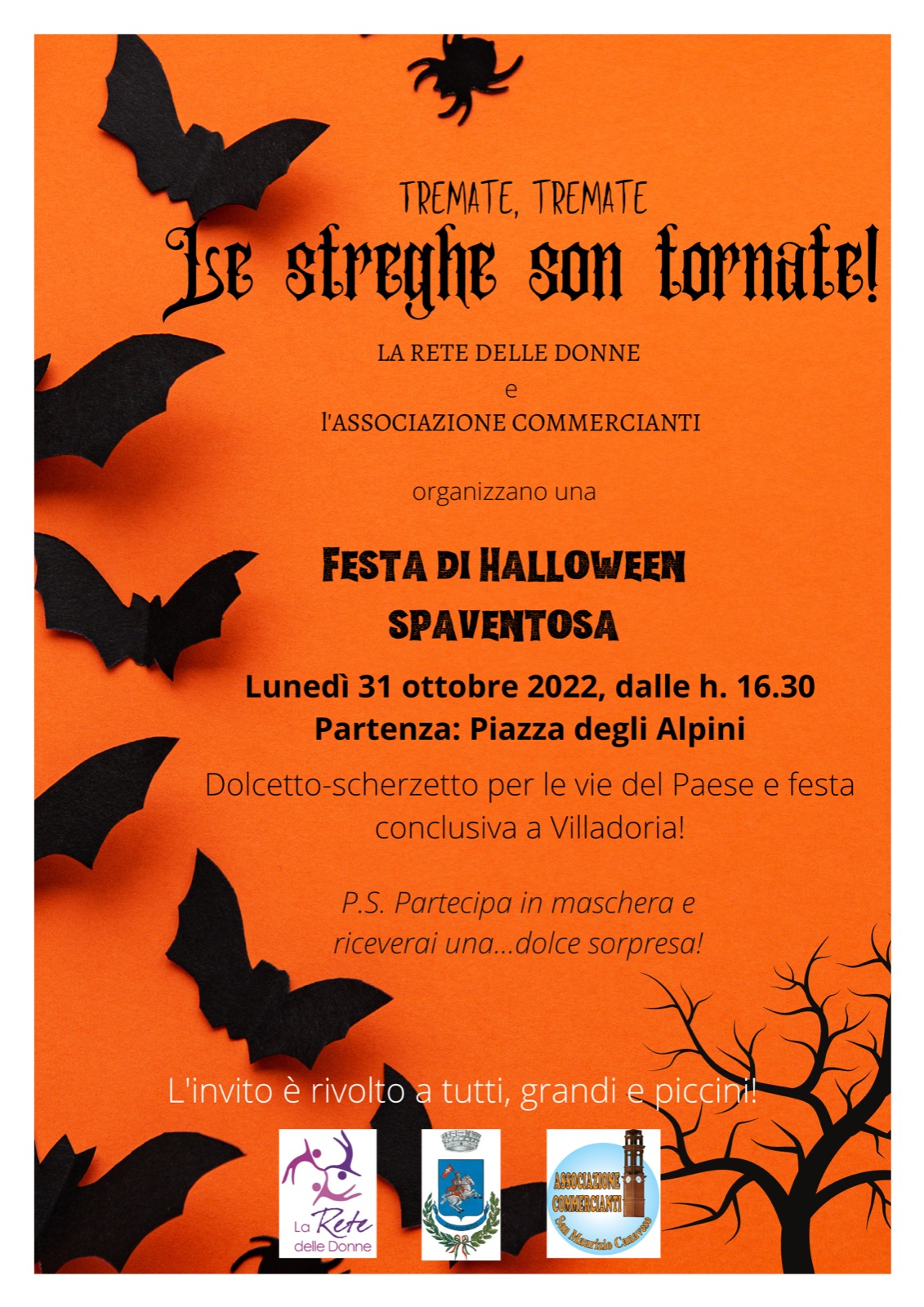 Sarà davvero “spaventosa” la speciale festa di Halloween organizzata dalla Rete delle Donne e dall'Associazione Commercianti, con il patrocinio del Comune. L'appuntamento è per lunedì 31 ottobre alle ore 16,30 in piazza degli Alpini. Fin dalle ore 16, i bambini della scuola dell'infanzia e della primaria, che avranno terminato il proprio orario pomeridiano, potranno lasciare zaini e cartelle all'interno della sede degli Alpini e tornare a riprenderli una volta terminata la festa. Dalla piazza degli Alpini si partirà per un immancabile “dolcetto o scherzetto” per le vie del paese e si raggiungerà poi Villadoria per la festa finale. L'invito, naturalmente, è a partecipare in maschera!