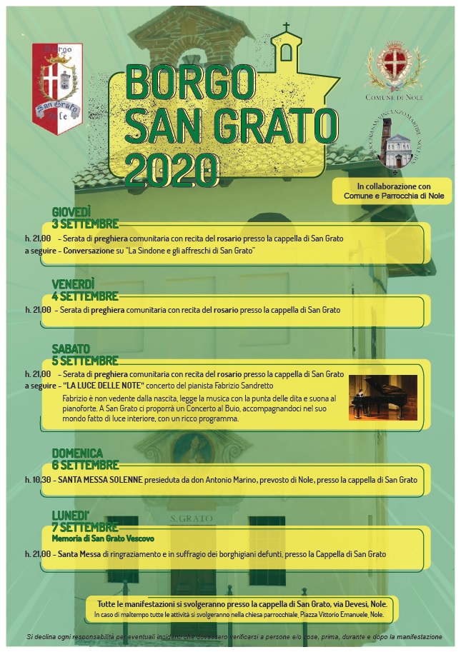 Si precisa che tutte le manifestazioni si svolgeranno presso la cappella di San Grato, in via Devesi. In caso di maltempo tutte le attività si svolgeranno presso la Chiesa Parrocchiale di S.Vincenzo Martire in piazza Vittorio Emanuele.