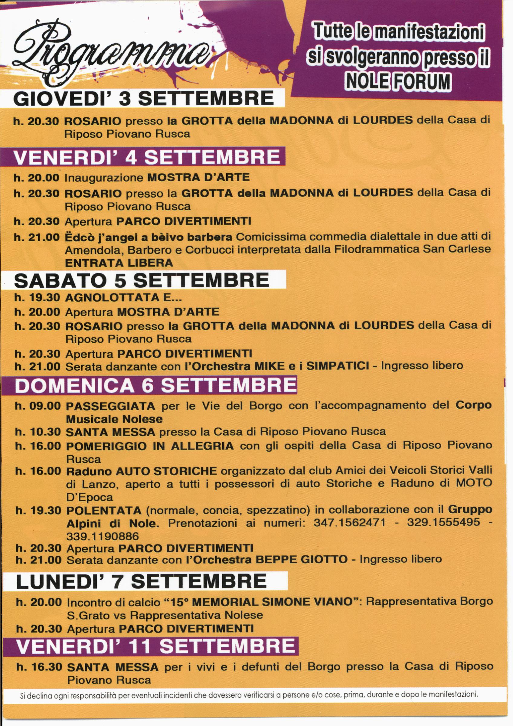 -Venerdì 4 settembre alle ore 21,00 presso la struttura "Nole forum" (ex Erber) "Ëdcò j'angei a bèivo barbera", commedia di Amendola e Corbucci interpretata dalla filodrammatica Sancarlese INGRESSO LIBERO;
