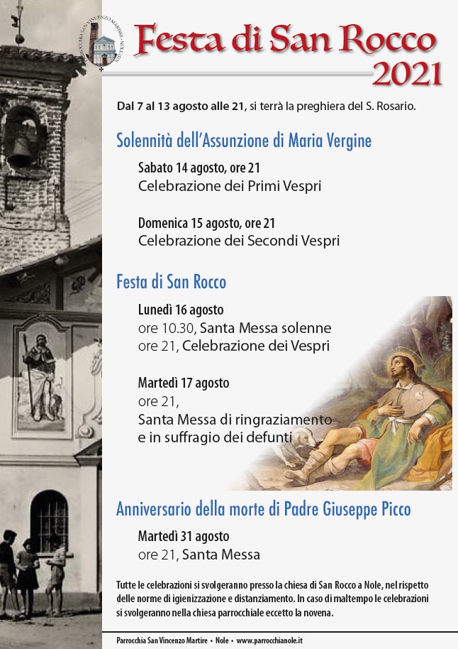 Tutte le celebrazioni si svolgeranno presso la chiesa di S.Rocco a Nole, nel rispetto delle norme di igienizzazione e distanziamento. In caso di maltempo le celebrazioni si svolgeranno nella chiesa parrocchiale eccetto la novena.