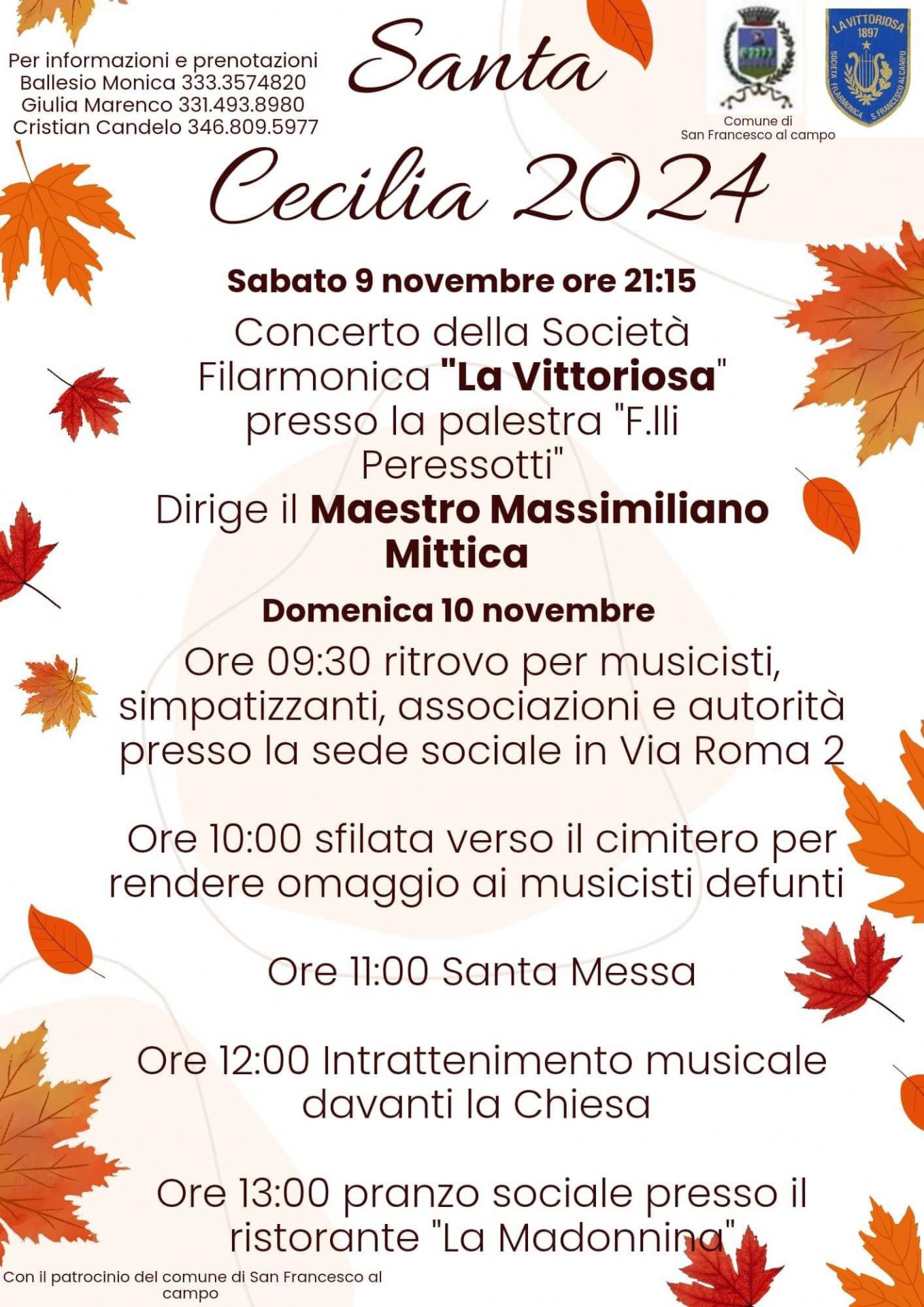Questo fine settimana la Filarmonica "La Vittoriosa" sarà in festa per Santa Cecilia. Sabato 9 novembre, alle ore 21.15, siamo tutti invitati nella palestra comunale "Fratelli Peressotti" per il tradizionale concerto diretto dal maestro Massimiliano Mittica. La festa continuerà domenica 10 con la consueta passeggiata musicale per le vie del paese, la messa delle 11 nella chiesa parrocchiale e il pranzo.