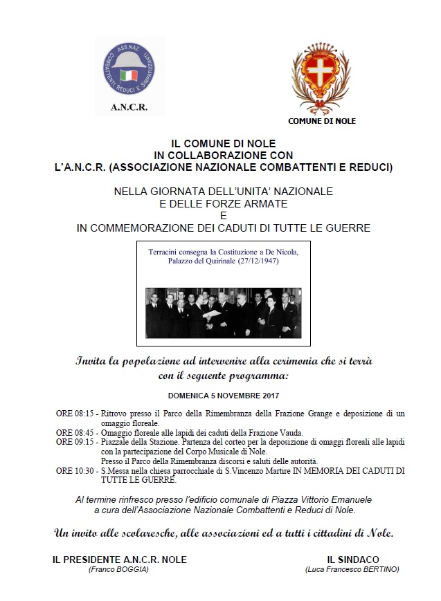 IL COMUNE DI NOLE IN COLLABORAZIONE CON L’A.N.C.R. (ASSOCIAZIONE NAZIONALE COMBATTENTI E REDUCI) NELLA GIORNATA DELL’UNITA’ NAZIONALE E DELLE FORZE ARMATE E IN COMMEMORAZIONE DEI CADUTI DI TUTTE LE GUERRE