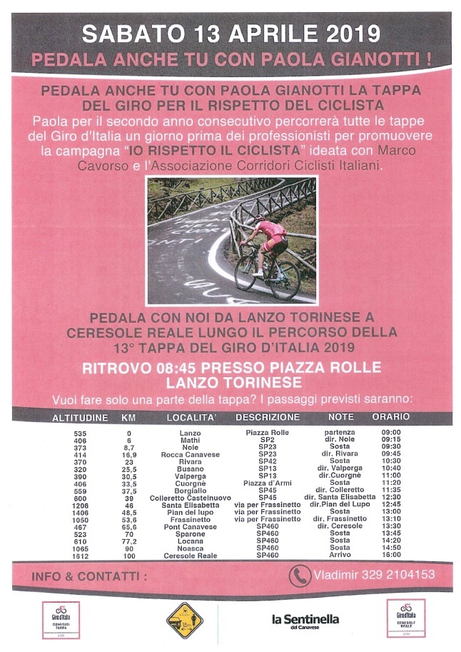 Nell'ambito delle iniziative per il Giro d'Italia 2019, "PEDALA ANCHE TU CON PAOLA GIANOTTI LA TAPPA DEL GIRO PER IL RISPETTO DEL CICLISTA"