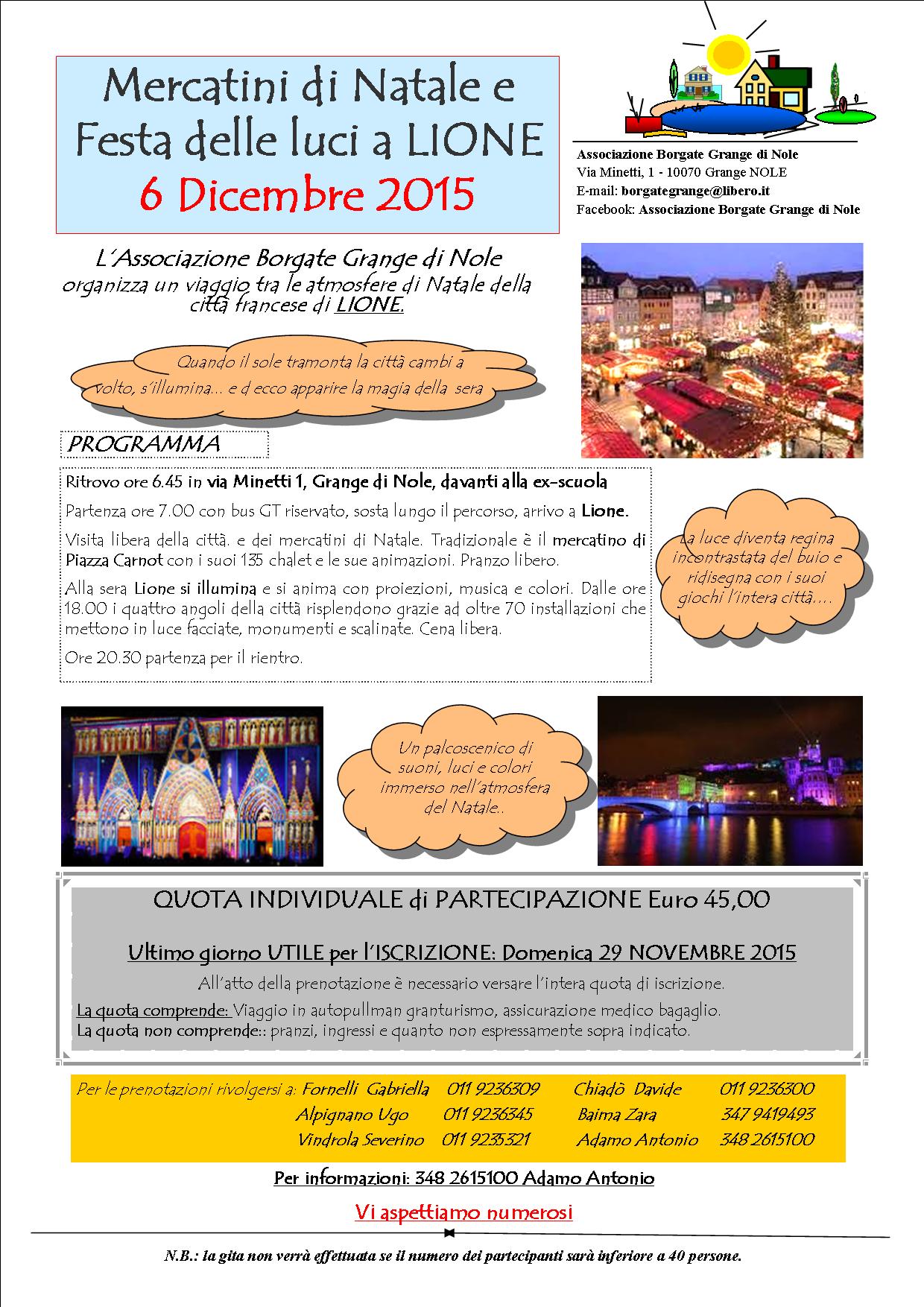L'Associazione delle Borgate di Grange di Nole organizza, per il giorno domenica 6 dicembre 2015, una gita a Lione per i mercatini di Natale e per la "Festa delle luci".
