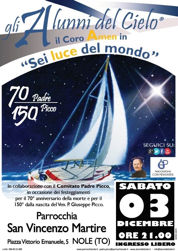 La Parrocchia di S.Vincenzo Martire, in collaborazione con il Comitato Padre Picco, in occasione dei festeggiamenti per il 70° anniversario della morte e per il 150° anniversario dalla nascita del Venerabile Giuseppe Picco, organizza per sabato 3 dicembre 2016 alle ore 21,00 un concerto del coro Amen "Sei luce del mondo".