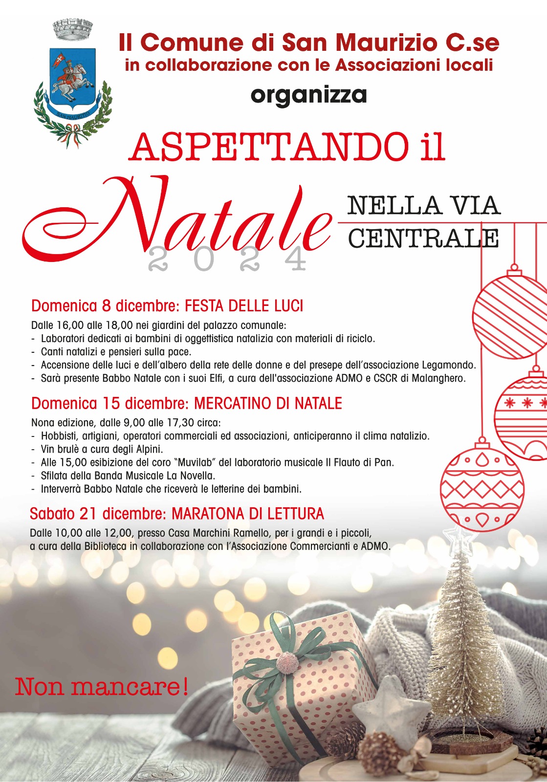 Si comincia domenica 8 dicembre, festa dell'Immacolata, con la Festa delle Luci nei giardini del municipio a partire dalle ore 16: laboratori per bambini, canti natalizi, accensione delle luci dell'albero e del presepe… e naturalmente Babbo Natale con i suoi Elfi!