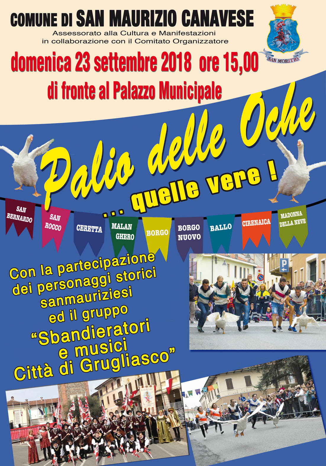 Tornano le oche. Ma proprio le oche, quelle vere. L'attrazione principale della festa patronale ripropone la versione "originale" del palio, dopo che l'anno scorso, a causa del rischio di trasmissione dell'influenza aviaria, le amiche pennute erano state sostituite da volonterosi cittadini travestiti da oche. Il risultato fu egualmente soddisfacente, ma la sostituzione dei pennuti originali non sfuggì ai più. Quest'anno, passata l'emergenza, si ritorna all'antico. L'appuntamento è per domenica 23 settembre, alle ore 15, di fronte al municipio.