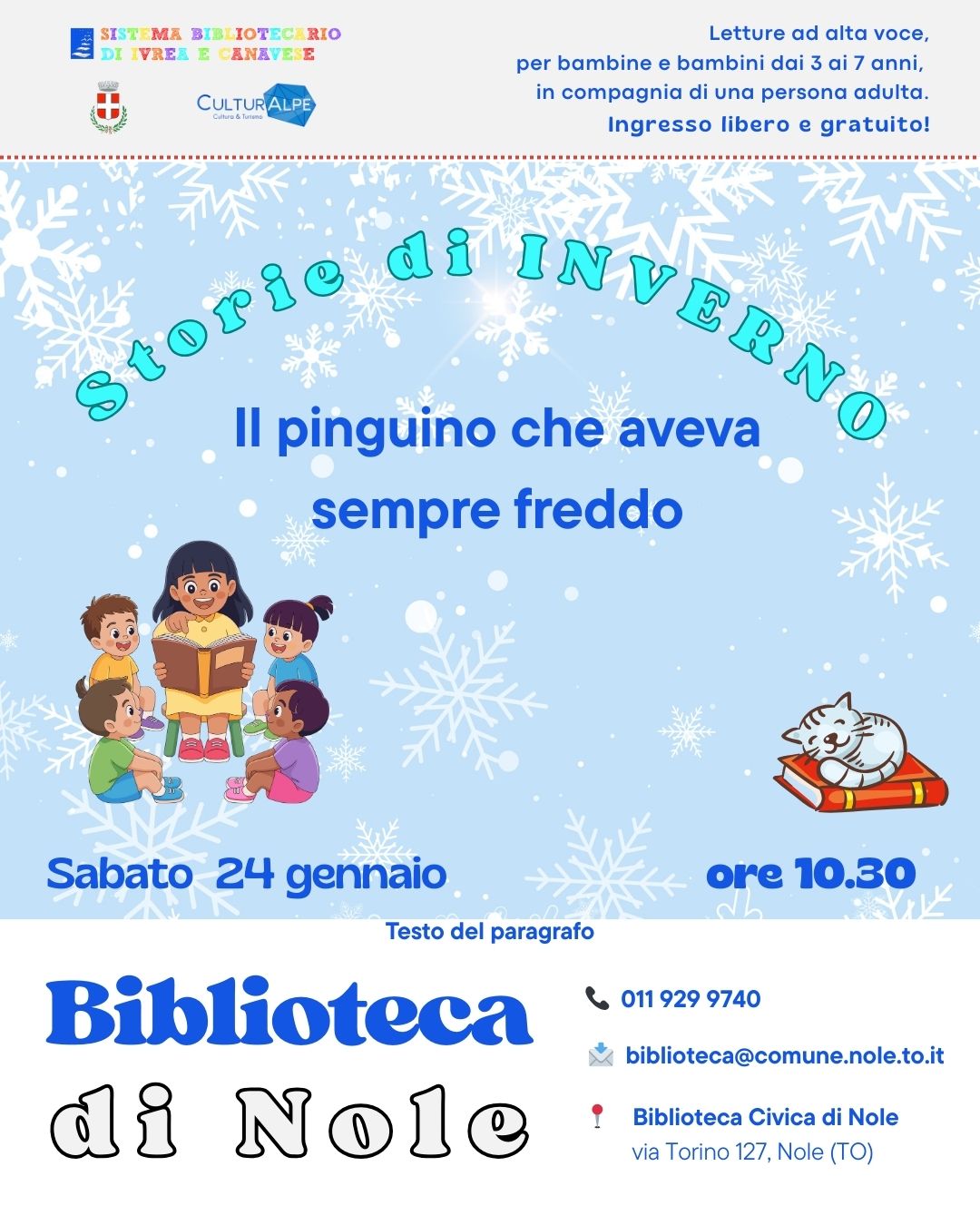 Anche questo sabato ci incontriamo in biblioteca con il consueto appuntamento per ascoltare le nostre "calde" storie che parlano di inverno con "Il pinguino che aveva sempre freddo". L'iniziativa - in programma il 24 gennaio a partire dalle 10,30 nei locali di via Torino 127 - è rivolta alle bambine e ai bambini dai 3 ai 7 anni, in compagnia di una persona adulta.