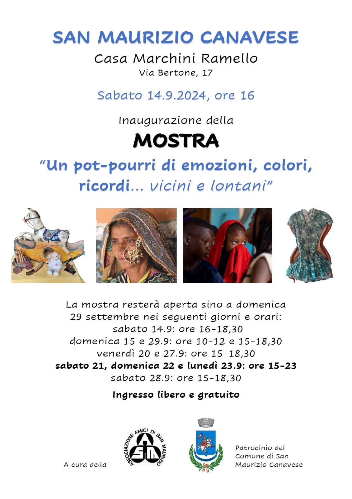 Sabato prossimo, 14 settembre, alle ore 16 a Casa Marchini Ramello (via Bertone 17) sarà inaugurata la mostra “Un pot-pourri di emozioni, colori, ricordi… vicini e lontani” organizzata dall'associazione Amici di San Maurizio in occasione della festa patronale. La mostra, a ingresso libero e gratuito, resterà aperta fino a domenica 29 settembre nei seguenti orari: