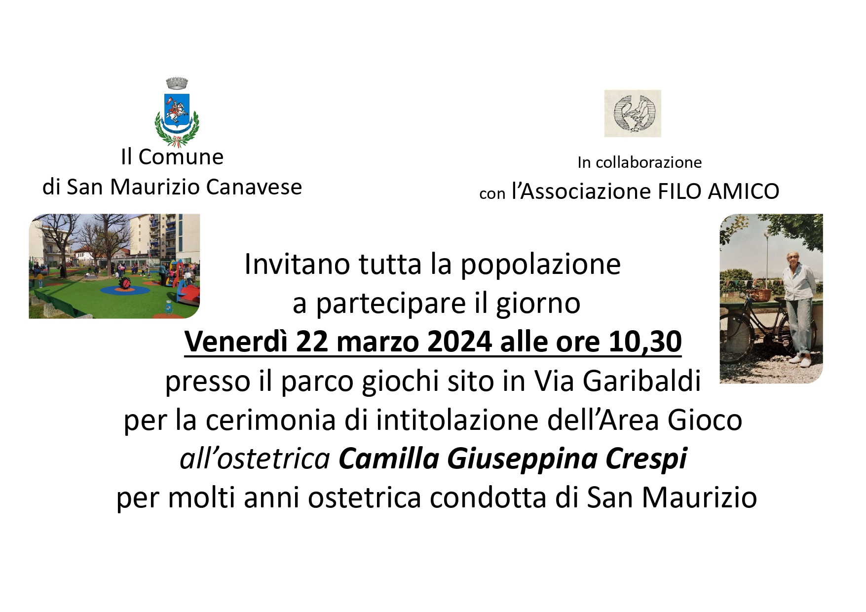 Come annunciato in occasione della sua inaugurazione dopo gli importanti interventi di rinnovamento e riqualificazione, il parco giochi compreso fra via Garibaldi e vicolo Ferrovia sarà intitolato a Giuseppina Crespi, indimenticata ostetrica del paese che ha fatto nascere generazioni di sanmauriziesi. La cerimonia di intitolazione, insieme agli eredi di Giuseppina Crespi, all'associazione Filo Amico e ai bambini della scuola dell'infanzia, si svolgerà venerdì 22 marzo alle ore 10,30 nello stesso parco giochi. Naturalmente siete tutti invitati a partecipare.