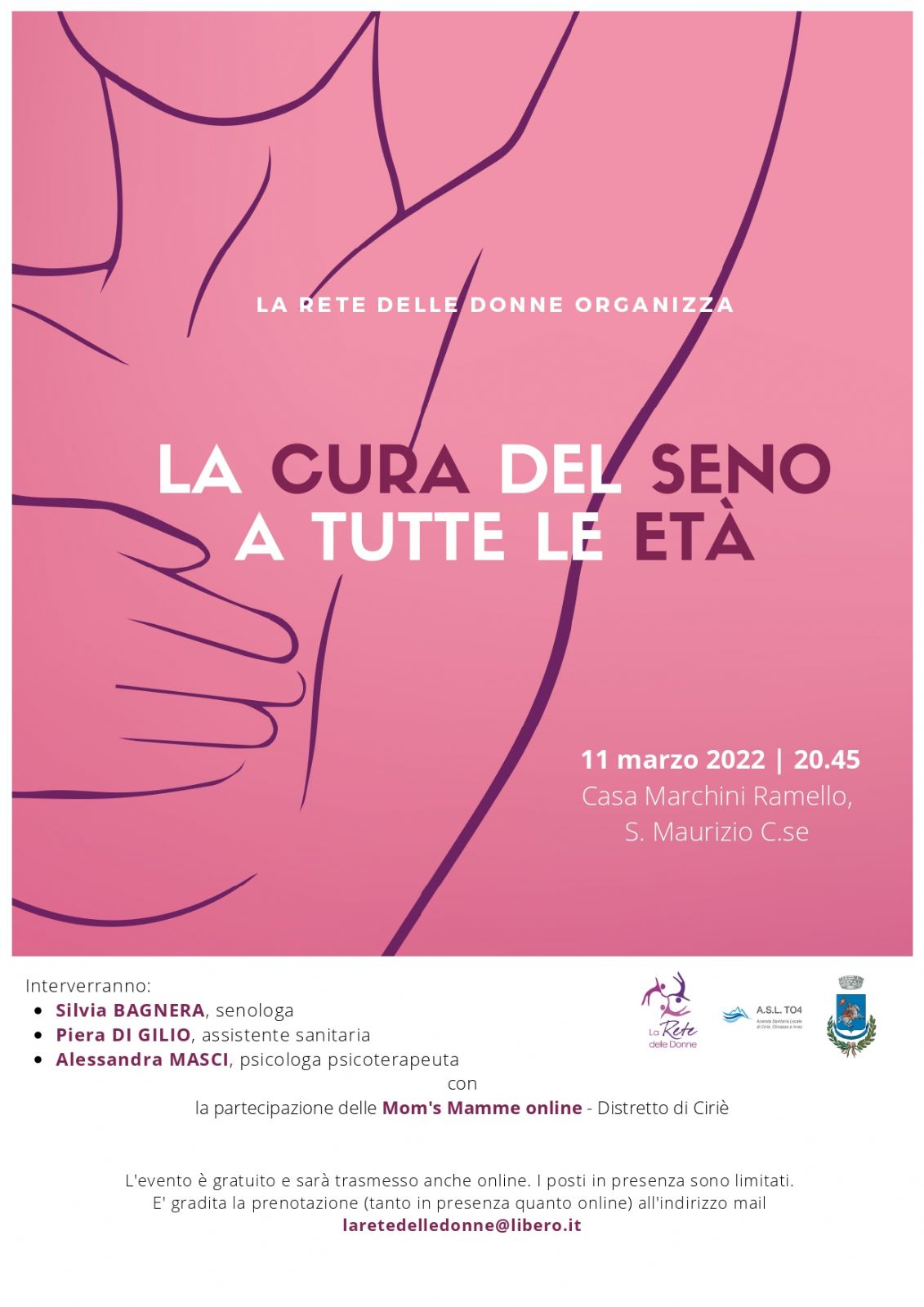 La Rete delle Donne, con il patrocinio del Comune e in collaborazione con l'Asl TO4 organizza una serata sul tema "La cura del seno a tutte le età". L'appuntamento è per venerdì 11 marzo, alle ore 20.45, a Casa Marchini Ramello (via Bertone, 17). L'ingresso è gratuito e sarà trasmesso anche online. È gradita la prenotazione scrivendo a laretedelledonne@libero.it
