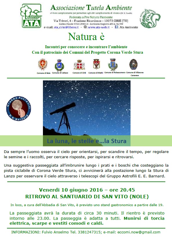 Nell'ambito degli incontri "NATURA E'" a cura dell'ATA (Associazione Tutela Ambiente) si terrà a Nole "LA LUNA, LE STELLE E... LA STURA", una suggestiva passeggiata all'imbrunire lungo i prati e i boschi che costeggiano la pista ciclabile di Corona Verde Stura di Lanzo per osservare il cielo attraverso i telescopi del gruppo astrofili "E.E.Barnard".