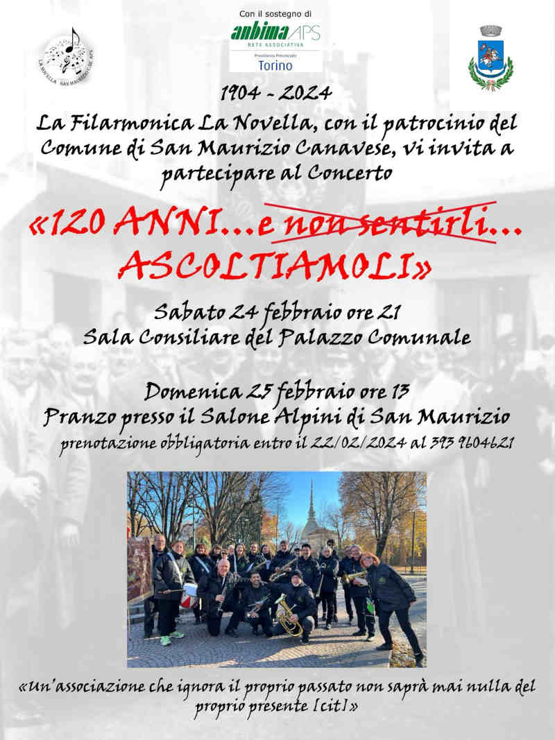 La Filarmonica La Novella ci invita a partecipare alle celebrazioni per i suoi primi 120 anni. Sabato 24 febbraio alle ore 21 il concerto nella sala consiliare del municipio. Domenica 25 alle 13 pranzo nel salone del Gruppo Alpini (per il pranzo è necessario prenotare entro il 22 febbraio telefonando al numero indicato nella locandina).