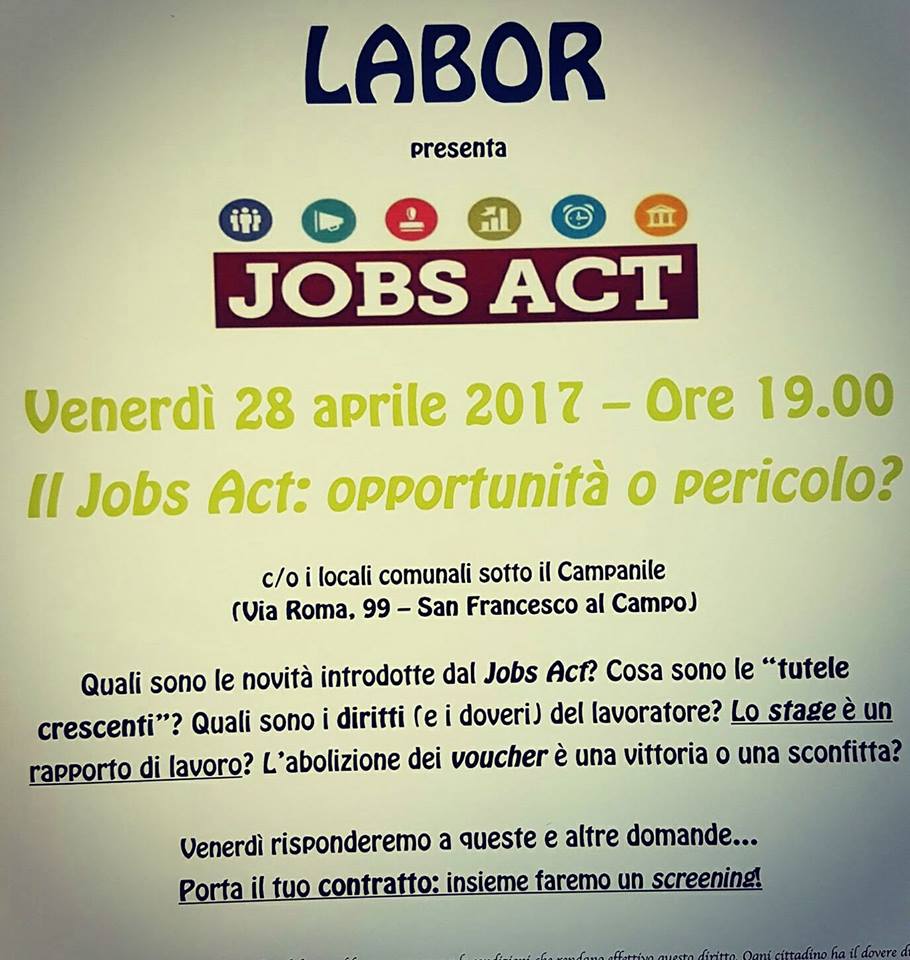 Questa sera, venerdì 28 aprile alle 19, ritorna l'appuntamento con Labor, nei locali comunali di via Roma 99, sotto il campanile. Tema della serata sarà "Jobs Act: opportunità o pericolo?". Ingresso libero. Per maggiori informazioni visitare la pagina Facebook @LaborSanfra.