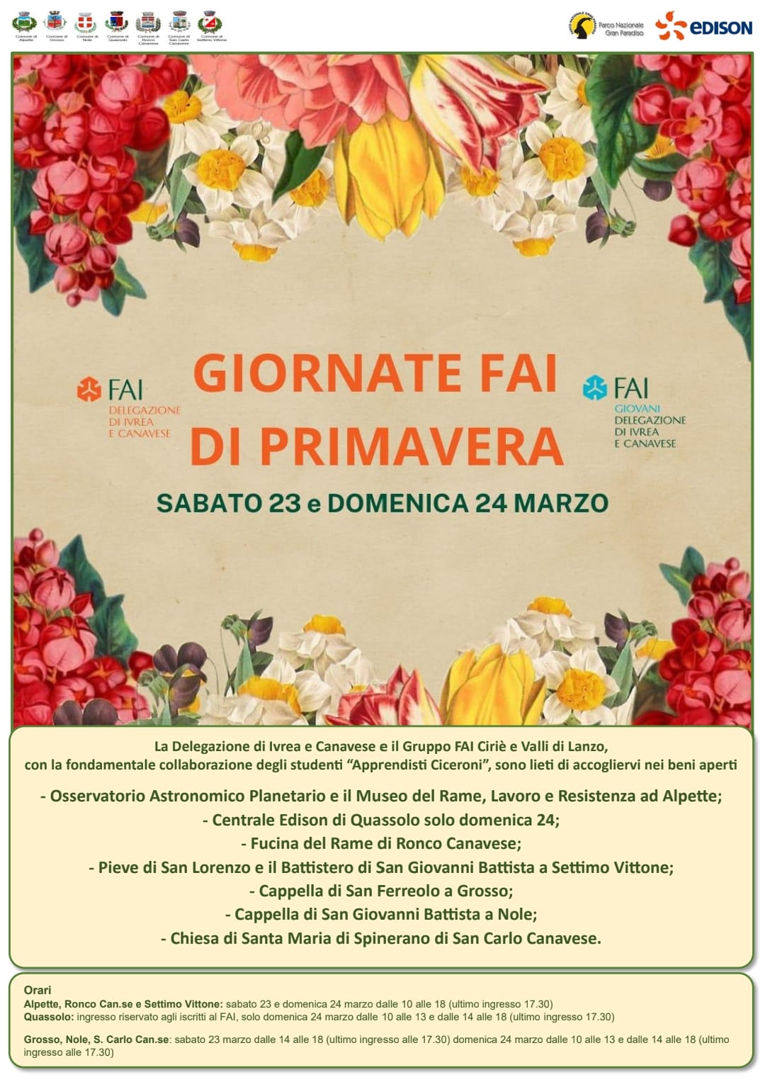 La Delegazione di Ivrea e Canavese e il Gruppo FAI Ciriè e Valli di Lanzo invitano la cittadinanza a partecipare alle Giornate FAI di Primavera alla scoperta di luoghi ricchi di arte e di fascino del “saper fare” in equilibrio con la natura del nostro Verde Canavese.