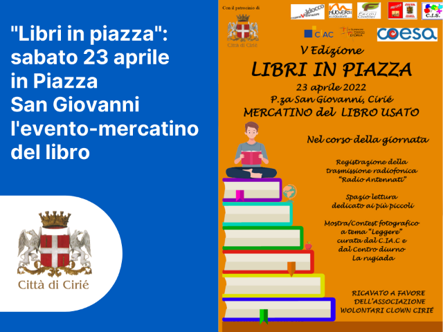 Sabato 23 aprile 2022, dalle 10 alle 18, si svolgerà in Piazza San Giovanni a Cirié la quinta edizione di "Libri in piazza", evento patrocinato dalla Città di Cirié.