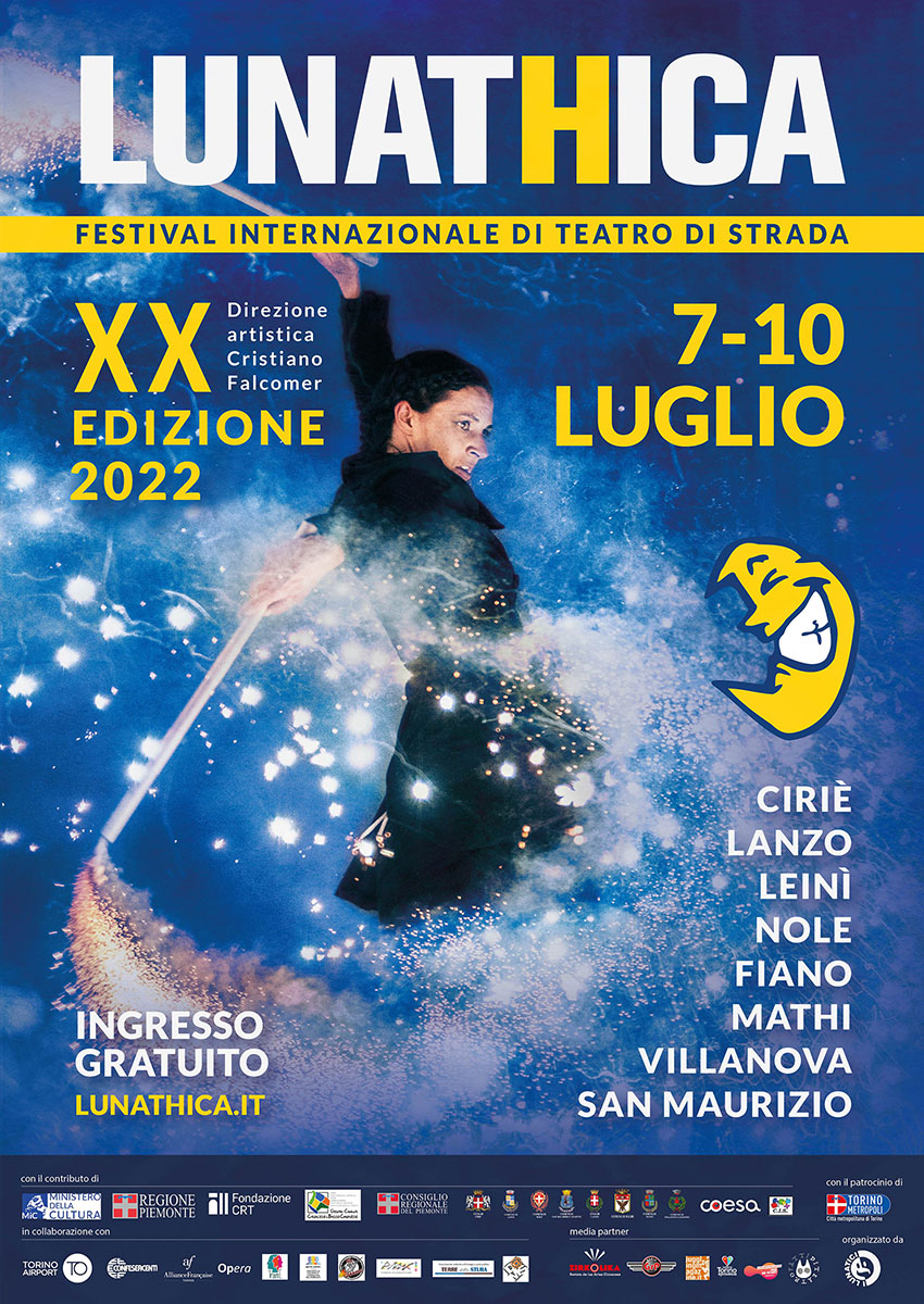 Dal 7 al 10 luglio torna Lunathica, il Festival Internazionale di Teatro di Strada diretto da Cristiano Falcomer che, in occasione della ventesima edizione, propone in quattro giorni (con orario mattutino, preserale e notturno) oltre 70 spettacoli di 13 compagnie internazionali nei comuni di Cirié, San Maurizio, Mathi, Nole, Fiano, Lanzo, Leinì e Villanova Canavese.