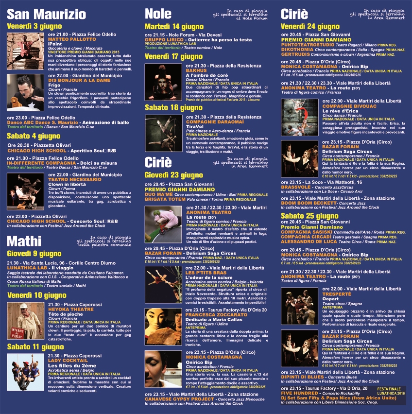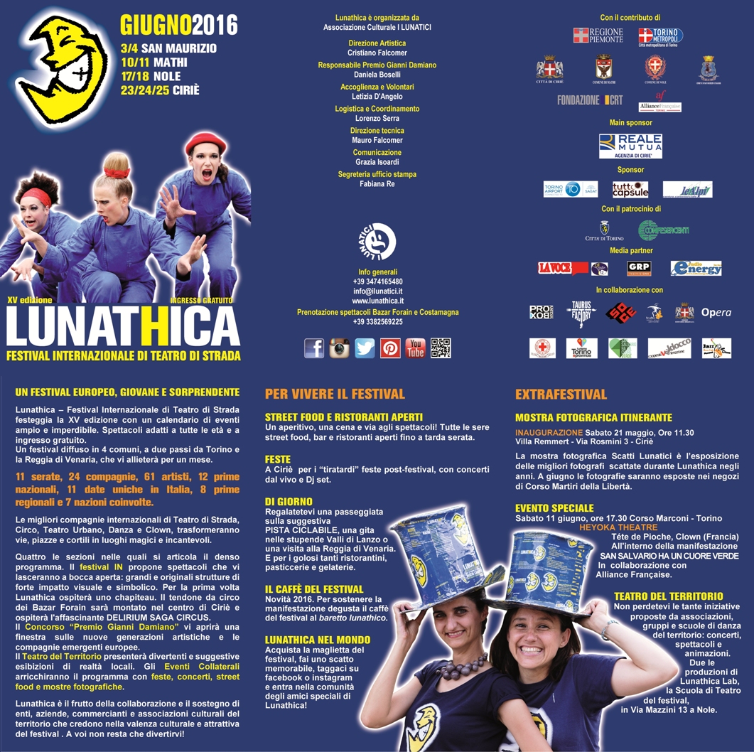 La XV edizione di Lunathica – Festival Internazionale di Teatro di Strada si terrà dal 3 al 25 giugno 2016 nei comuni di Ciriè, Nole, Mathi e San Maurizio Canavese (TO).