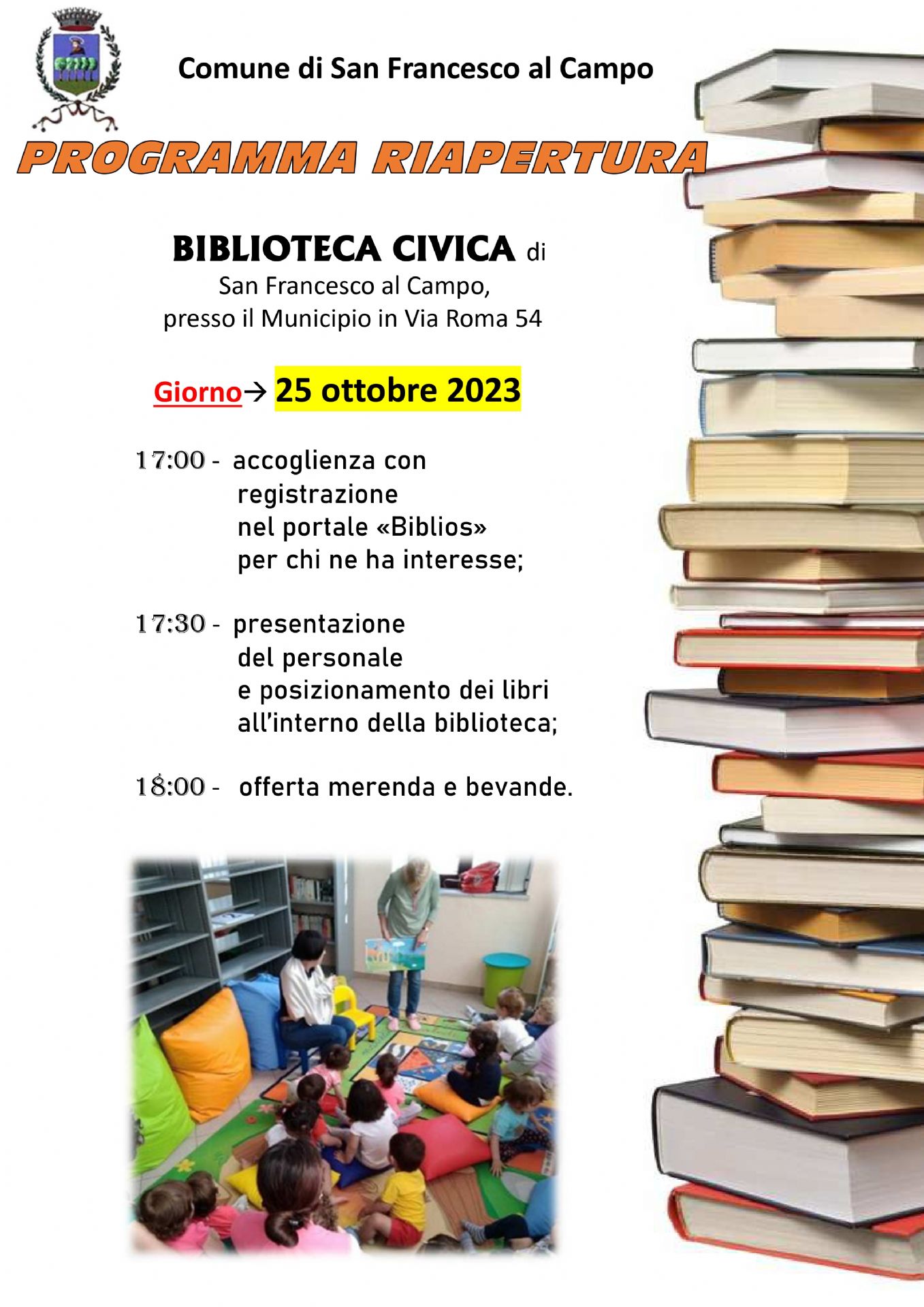Dalle ore 17 accoglienza con registrazione al portale Biblios, presentazione del personale e rinfresco con merenda e bevande
