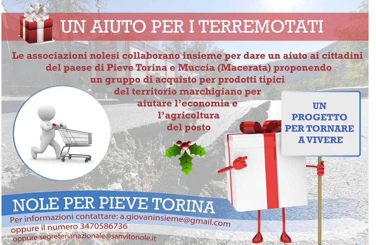Le associazioni nolesi collaborano per dare un aiuto ai cittadini terremotati di Pieve Torina e Muccia, in provincia di Macerata. Si propone un gruppo di acquisto di prodotti tipici marchigiani per aiutare le'economia e l'agricoltura del posto.