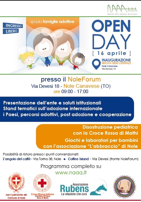 Un’occasione per incontrare la comunità di Nole e, allo stesso tempo, per fare festa insieme alle famiglie. Sabato 16 aprile il NAAA organizza l’open day nella nuova sede centrale: dopo quasi vent’anni passati a Ciriè, l’associazione ha preso casa negli uffici al quarto piano del palazzo di via Devesi 14 a Nole Canavese, in provincia di Torino. Un’intera giornata ricca di appuntamenti, durante la quale sarà possibile conoscere da vicino l’ente, il mondo delle adozioni internazionali, i progetti di cooperazione nei Paesi in via di sviluppo e le iniziative portate avanti in tutto il mondo. Il ritrovo è previsto alle 9, con i saluti della presidente Maria Teresa Maccanti e del sindaco di Nole, Luca Bertino, oltre che delle altre autorità e delle istituzioni presenti. Subito dopo ci sarà l’incontro informativo rivolto alle coppie in attesa e, in contemporanea, saranno allestiti una serie di stand tematici all’interno del NoleForum. Si potranno conoscere i Paesi in cui opera l'ente, il percorso adottivo e la formazione, senza dimenticare i progetti di cooperazione. A partire dalle 11, inoltre, l’associazione “L’Abbraccio” proporrà un corso di massaggio infantile. Ma non solo: durante tutta la giornata i volontari del comitato locale della Croce Rossa di Fiano – sede di Mathi terranno una serie di lezioni sulla disostruzione pediatrica, aperte a tutti gli interessati, mentre i giovani pionieri intratterranno i bambini ed i ragazzi con giochi ed animazione insieme alle educatrici dell’associazione “L’Abbraccio”, che proporranno alcuni laboratori.