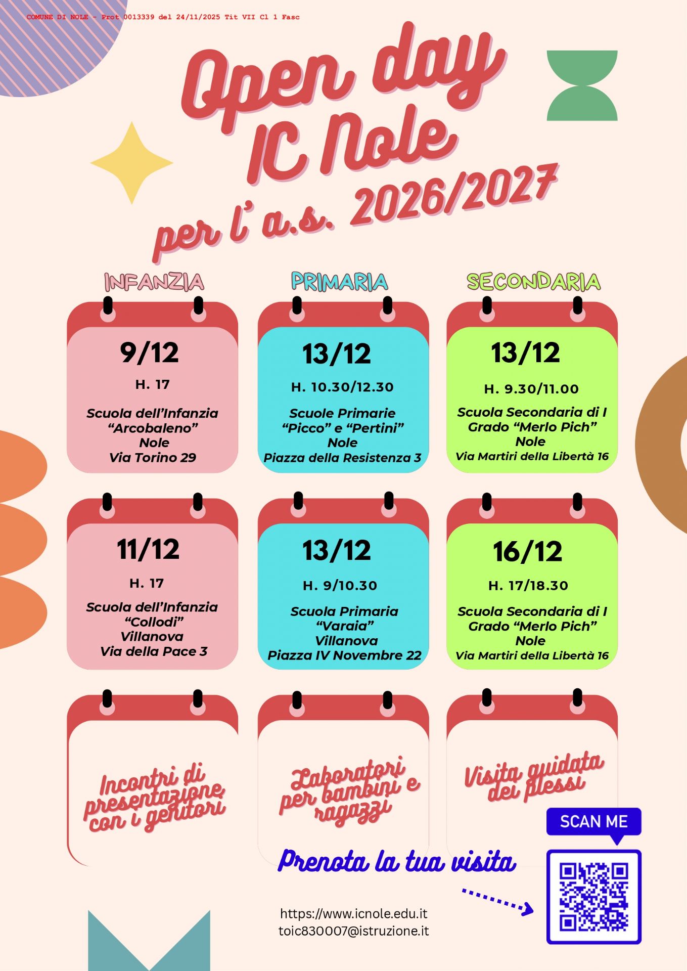 L’Istituto Comprensivo di Nole invita le famiglie agli Open Day per l’anno scolastico 2026/2027, un’importante occasione per conoscere l’offerta formativa, incontrare il personale docente, visitare gli ambienti scolastici e assistere alle attività laboratoriali predisposte per bambini e ragazzi.