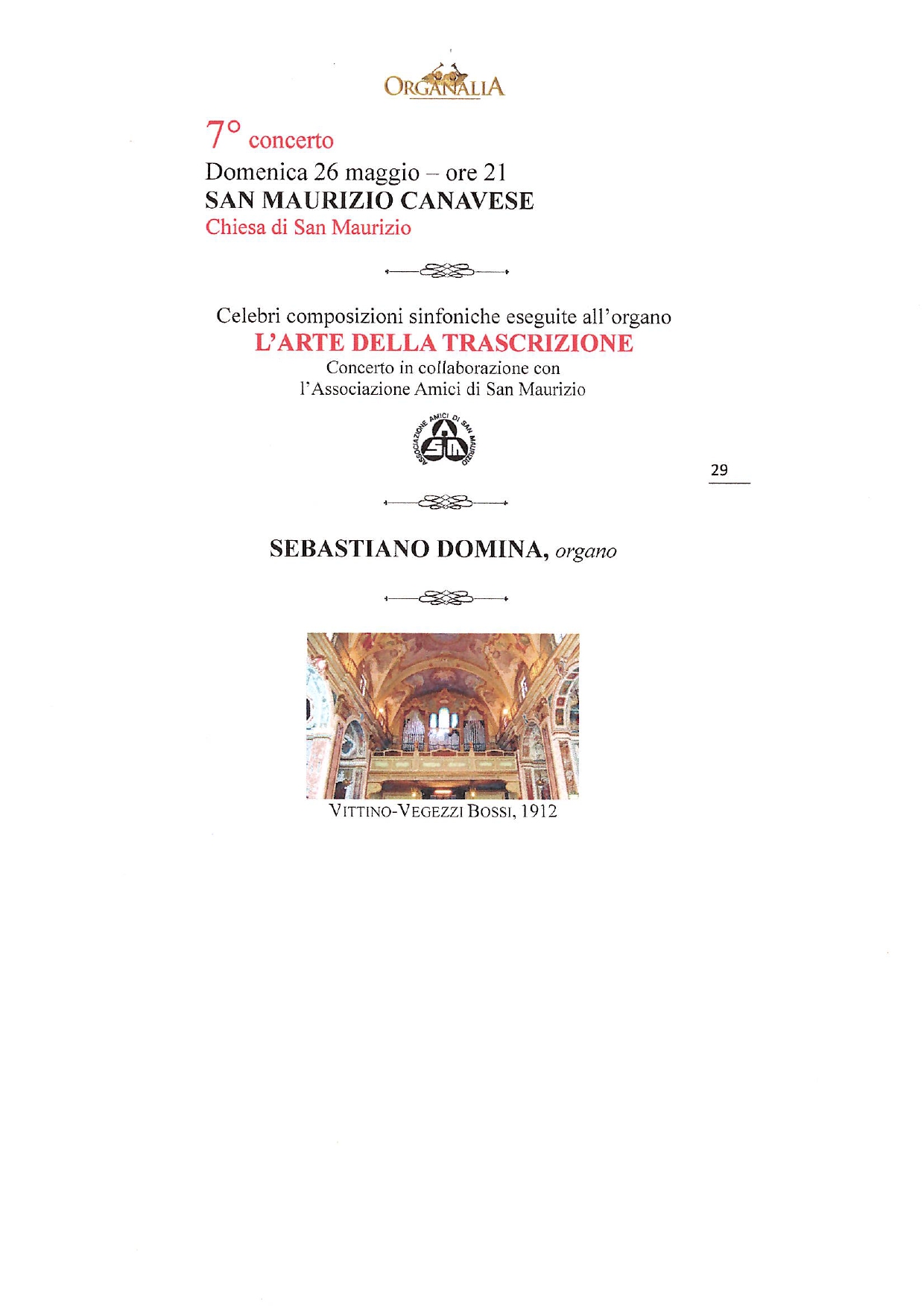 Secondo appuntamento in paese con Organalia, la rassegna concertistica per la promozione della musica organistica e strumentale sul territorio. Domenica 26 maggio alle ore 21 la chiesa parrocchiale di San Maurizio Martire ospiterà "L'arte della trascrizione", celebri composizioni sinfoniche eseguite all'organo da Sebastiano Domina.