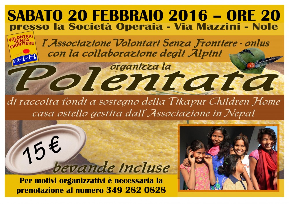Sabato 20 febbraio 2016 alle ore 20,00 l'Associazione Volontari senza Frontiere, in collaborazione con l'A.N.A. di Nole, presso la Società Operaia di via Mazzini organizza una polentata di raccolta fondi a sostegno della Tikapur Children Home (casa ostello gestita dall'organizzazione in Nepal).