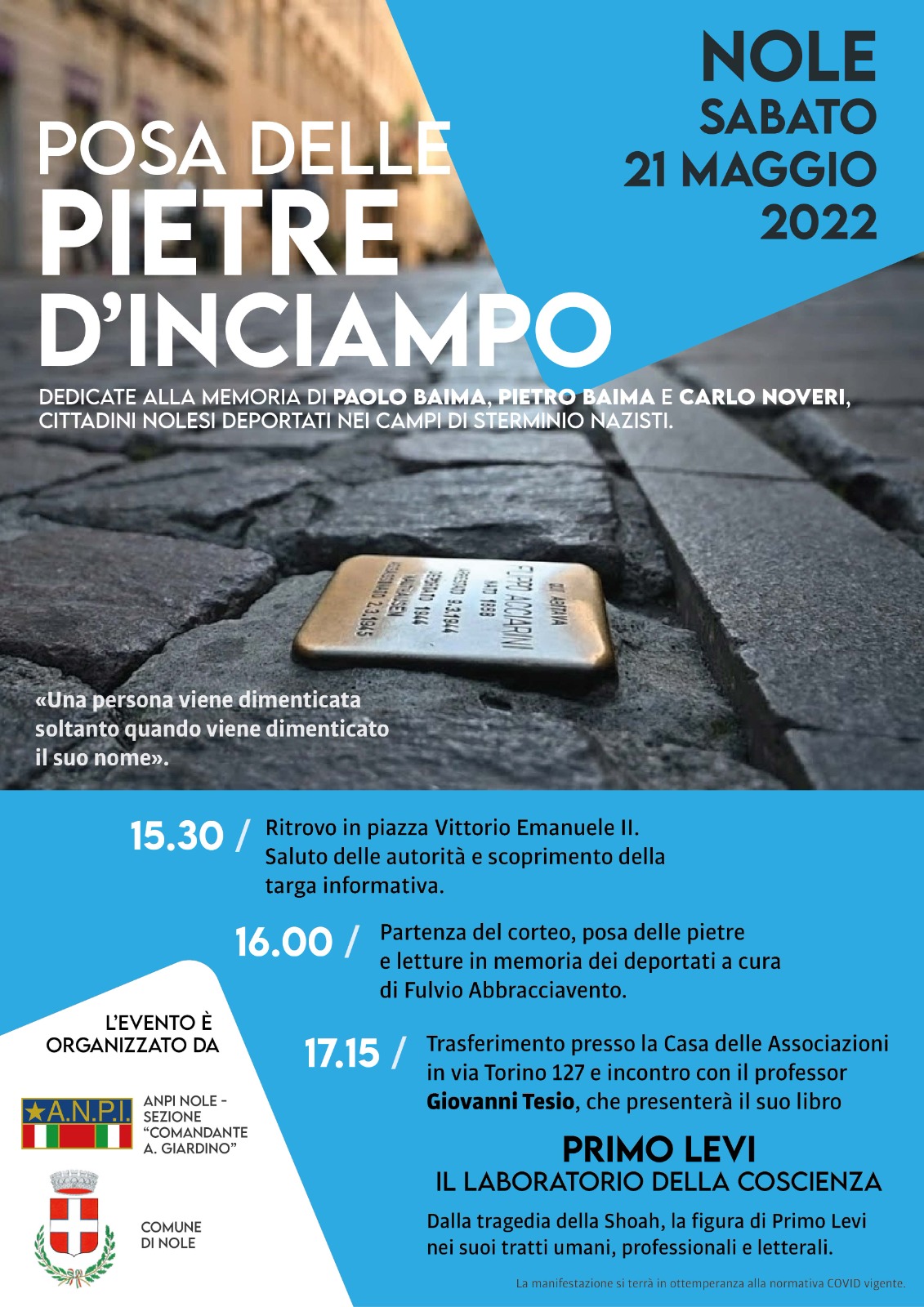 Sabato 21 maggio 2022 si terrà la posa delle pietre d'inciampo alla memoria di Paolo Baima, Pietro Baima e Carlo Noveri, cittadini nolesi deportati nei campi di sterminio nazisti.