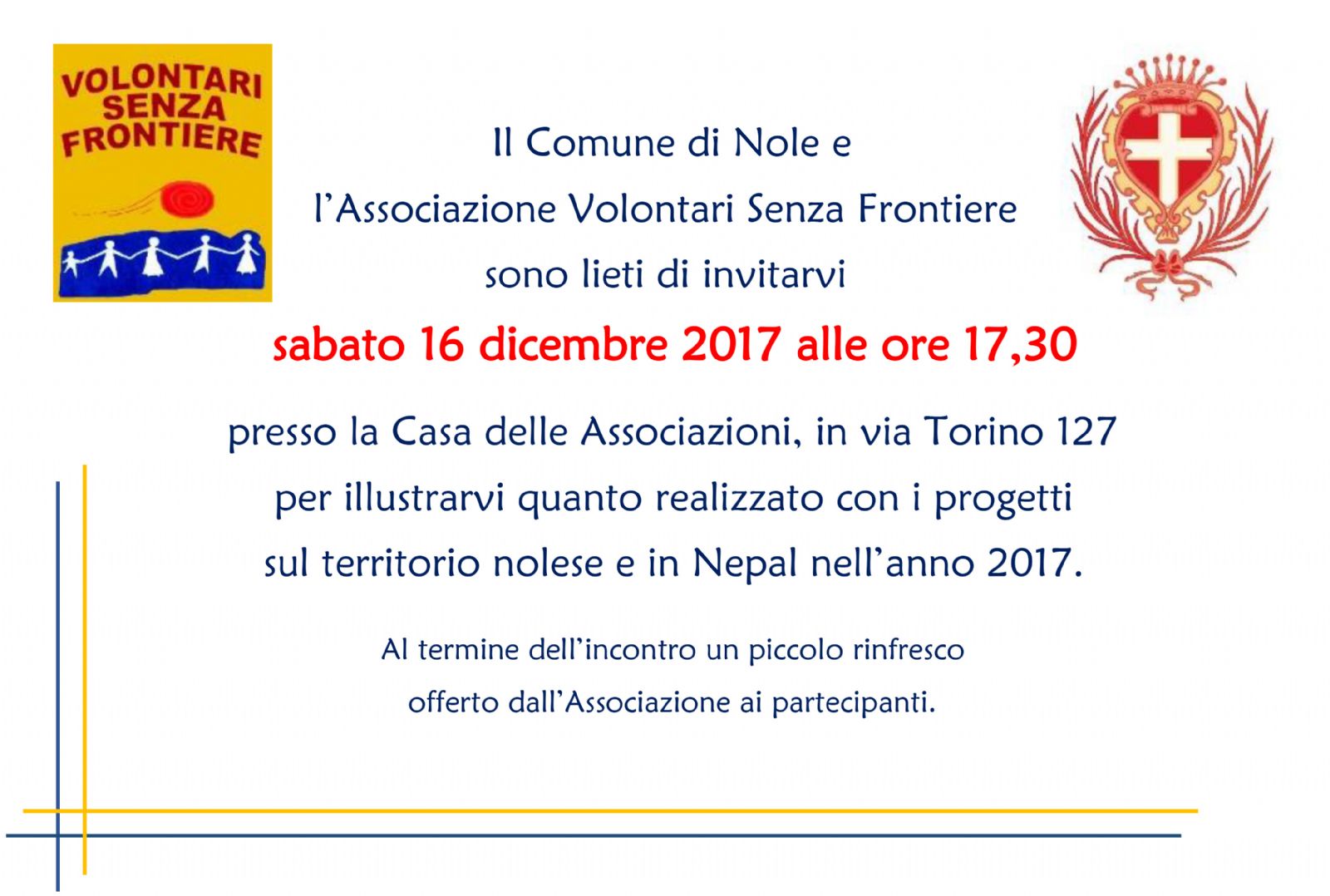 L'Associazione Volontari senza Frontiere invita le associazioni nolesi e tutta la cittadinanza presso la casa delle associazioni di via Torino 127 per illustrare quanto realizzato nel 2017.