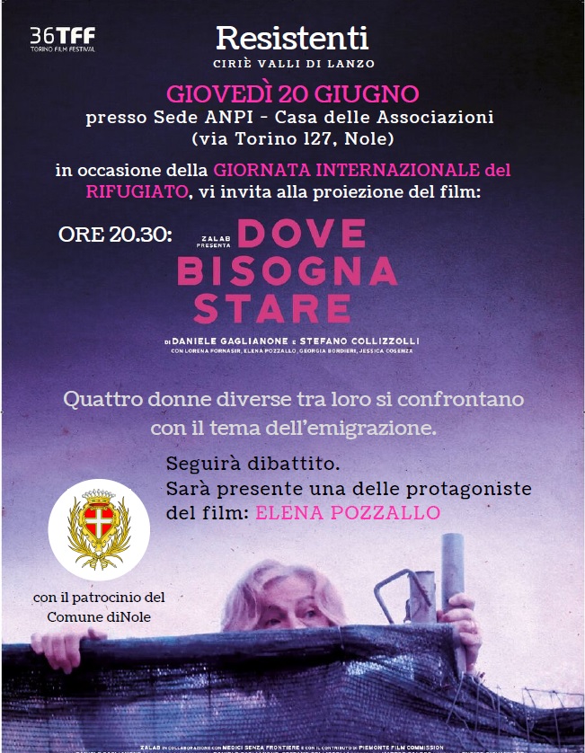 In concomitanza con la Giornata Internazionale del rifugiato, l'ANPI organizza, per giovedì 20 giugno 2019 ore 20,30, presso la sala incontri della Casa delle Associazioni di via Torino 127, la proiezione del film "Dove bisogna stare". Seguirà dibattito. Sarà presente una delle protagoniste del film, Elena Pozzallo.